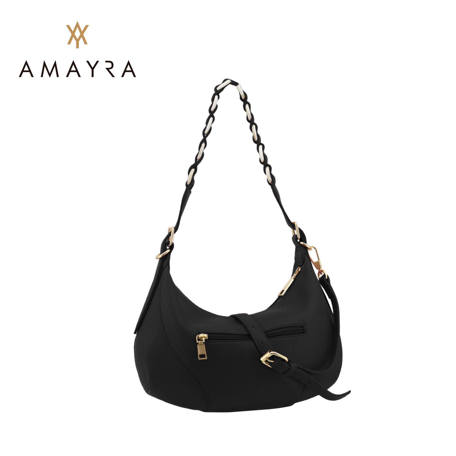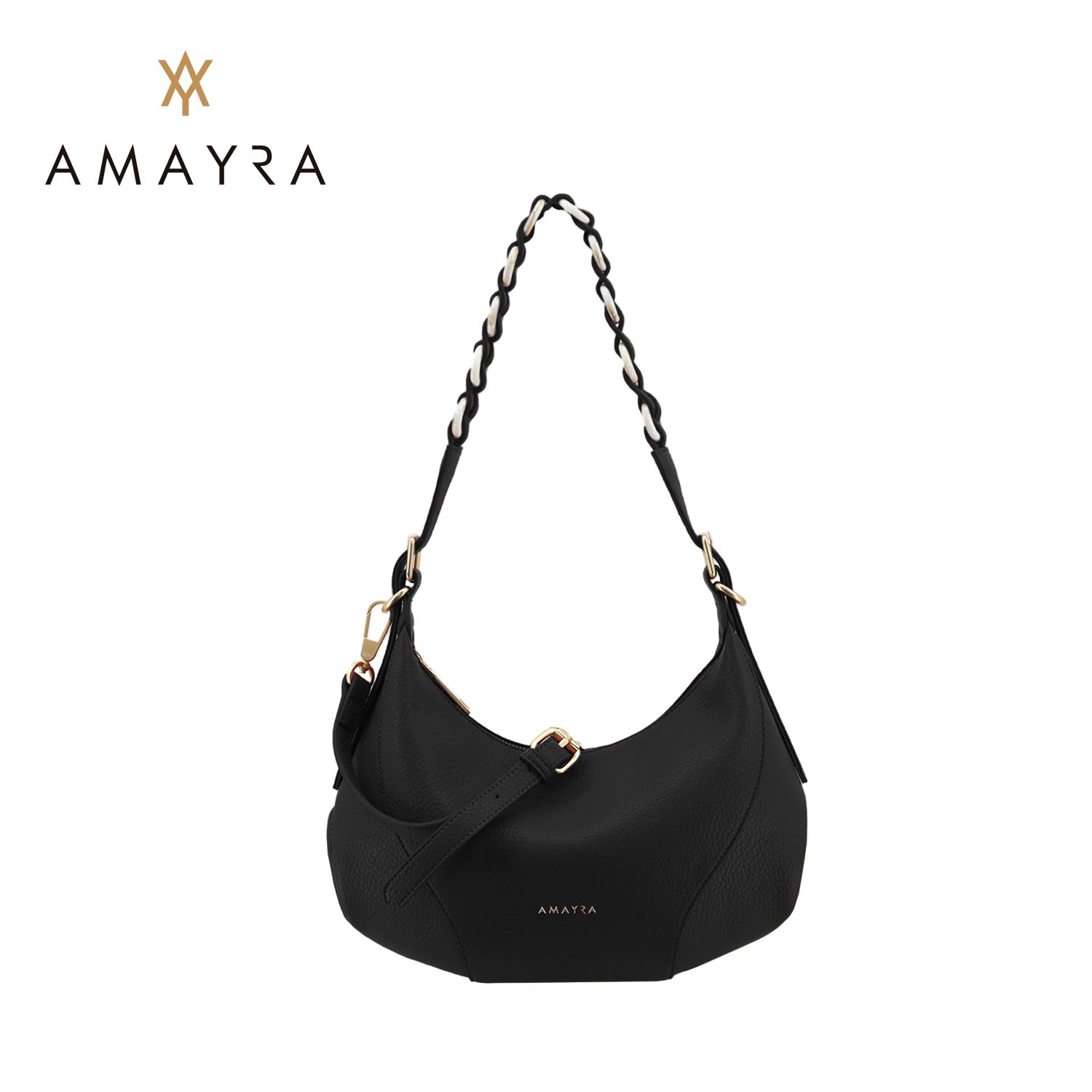 Su formato curvo tipo hobo bag y el detalle de manija trenzada con herrajes dorados la convierten en una pieza única.