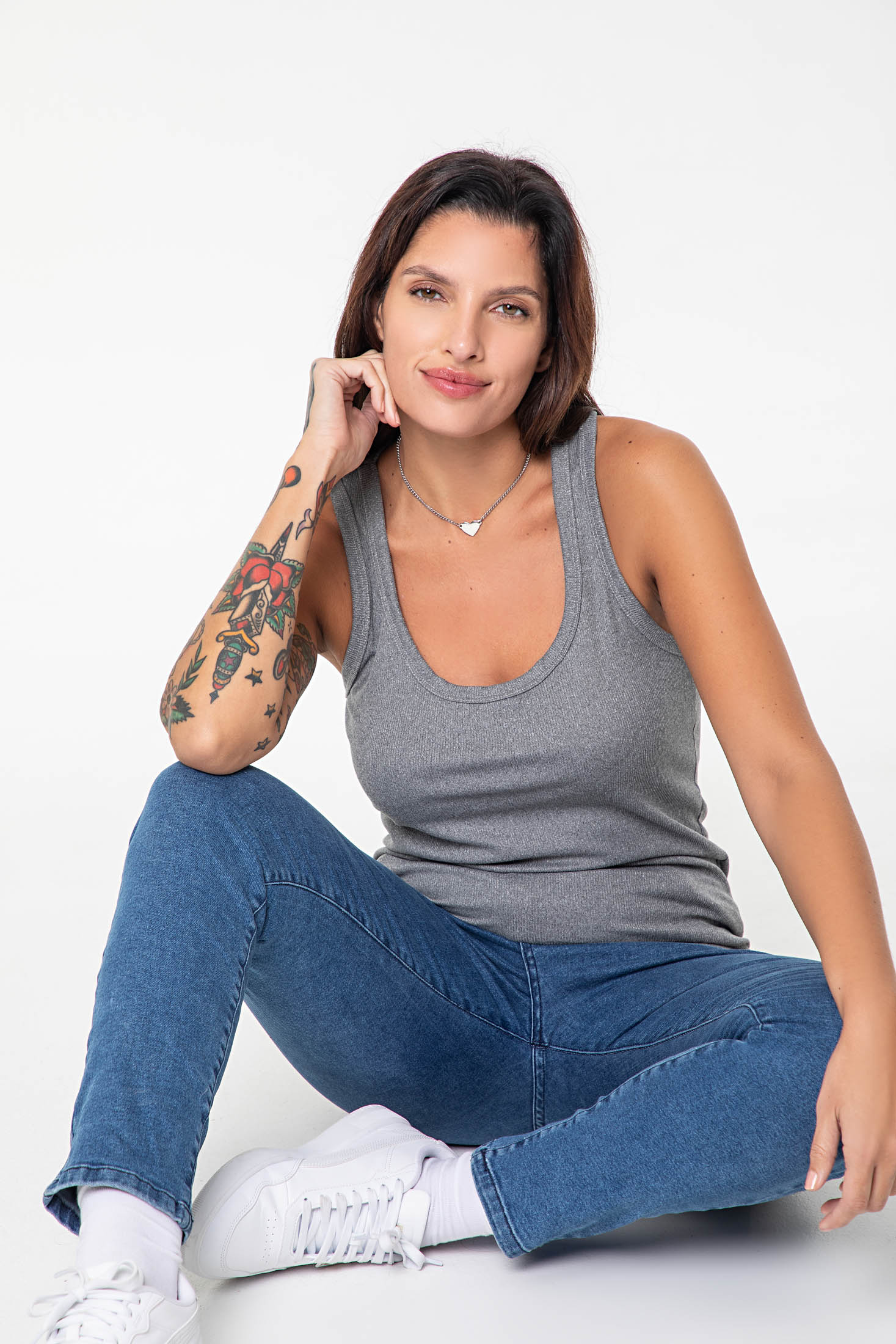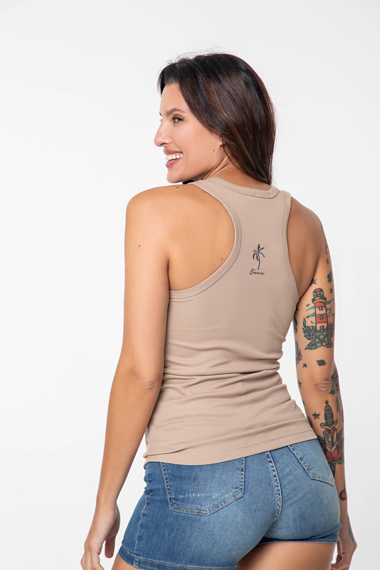 Camiseta en Morley. Musculosa escote abierto, con detalle bordado en espalda. Marca Bianca Secreta.