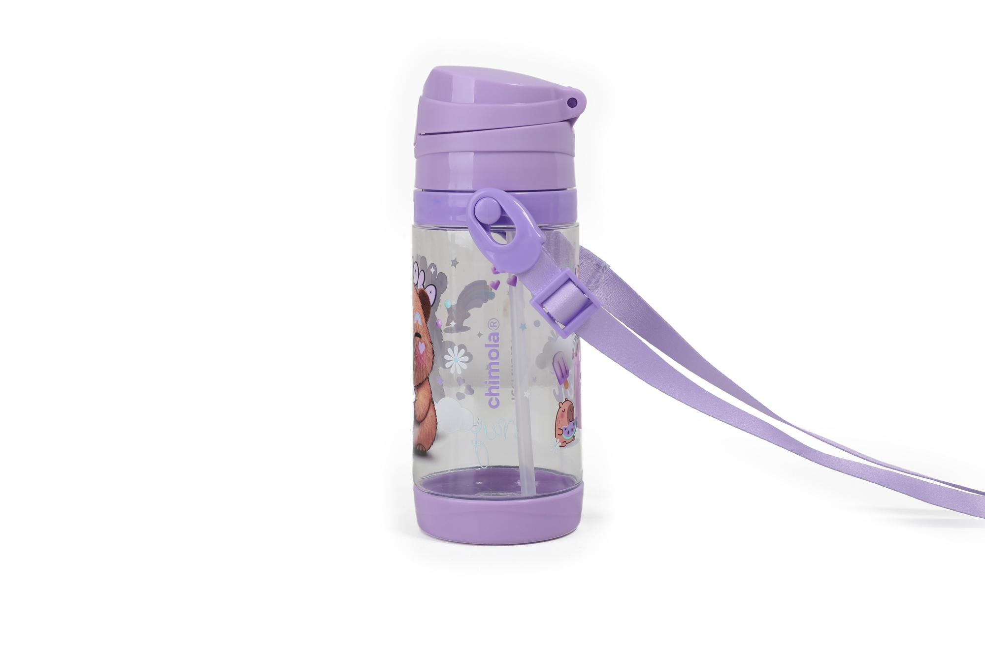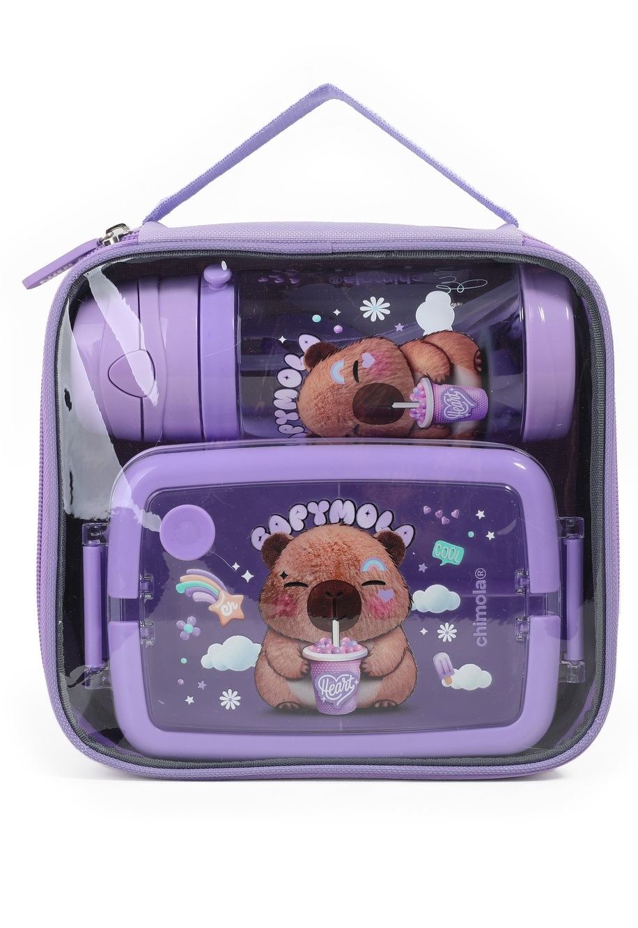 Con su estilo relajado y dulce, Capymola es el compañero ideal para quienes llevan el ritmo a su modo. Perfecto para peques soñadores y tranquilos. Este set escolar Chimola incluye lunchbox, botella y bolso transparente con manija en un packaging personalizado y lleno de onda. Es la solución práctica y divertida para llevar snacks e hidratación siempre a mano, con materiales resistentes y libres de BPA. El lunchbox cuenta con una tapa a presión con dos trabas de seguridad y divisiones internas que permiten organizar bien la comida. La botella tiene pico rÃgido, sorbete reutilizable, tapa abatible y correa ajustable. Todo se guarda en una bolsa compacta y resistente, ideal para transportar en la mochila o llevar en la mano.