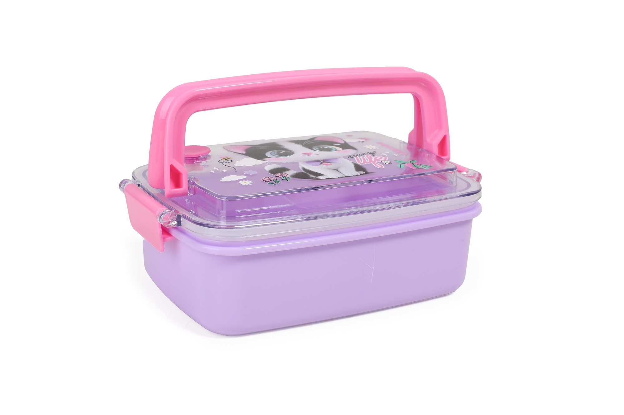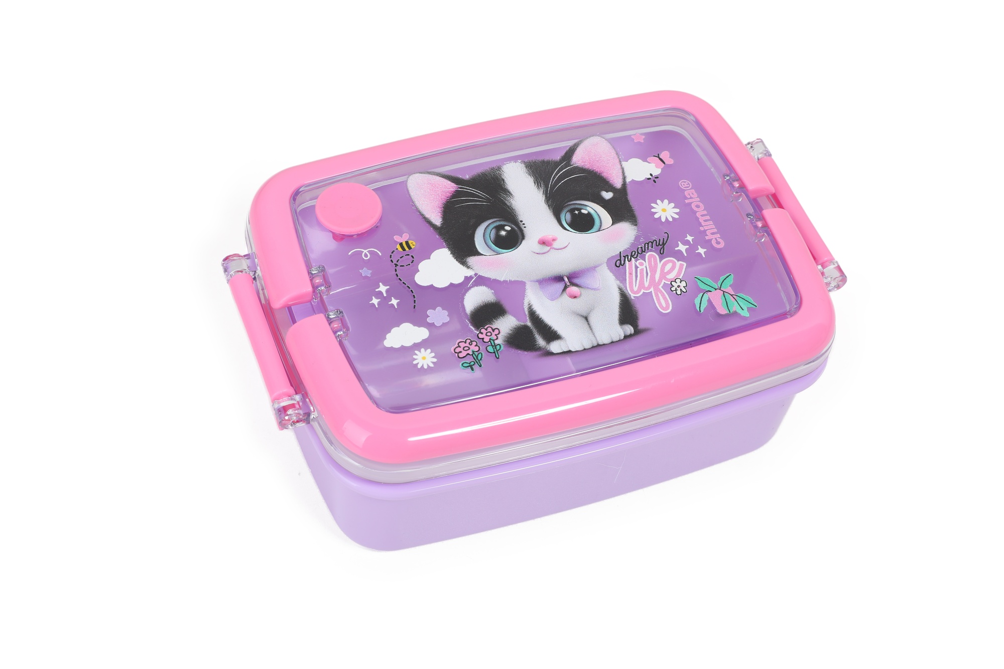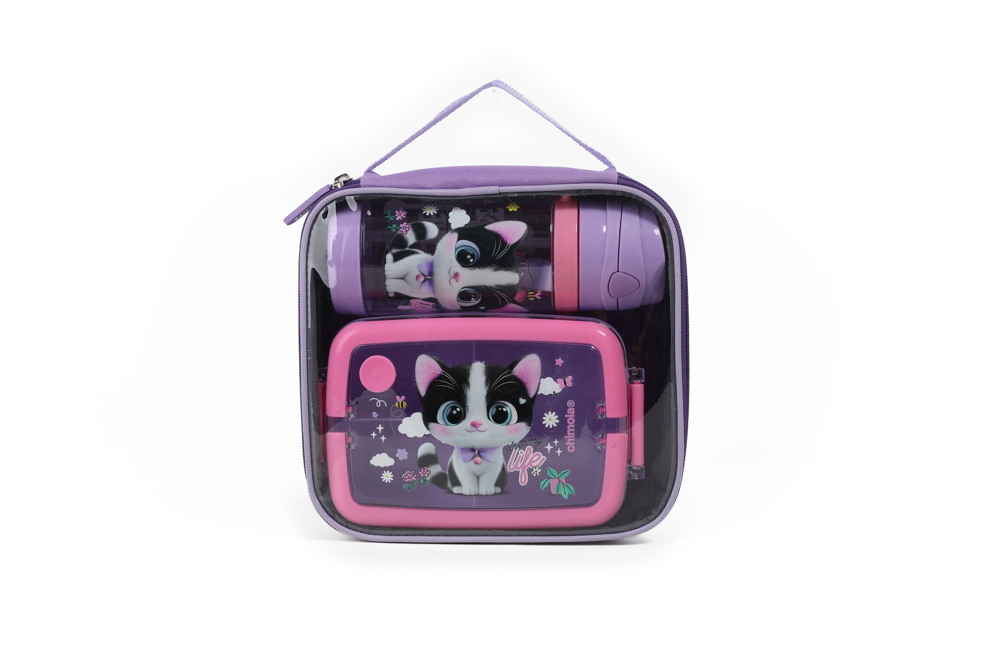 Curioso y súper expresivo, Cat es ideal para quienes viven cada dÃa como una aventura. Un diseño encantador con mirada pÃcara y fondo estrellado. Este set escolar Chimola incluye lunchbox, botella y bolso transparente con manija en un packaging personalizado y lleno de onda. Es la solución práctica y divertida para llevar snacks e hidratación siempre a mano, con materiales resistentes y libres de BPA. El lunchbox cuenta con una tapa a presión con dos trabas de seguridad y divisiones internas que permiten organizar bien la comida. La botella tiene pico rÃgido, sorbete reutilizable, tapa abatible y correa ajustable. Todo se guarda en una bolsa compacta y resistente, ideal para transportar en la mochila o llevar en la mano.