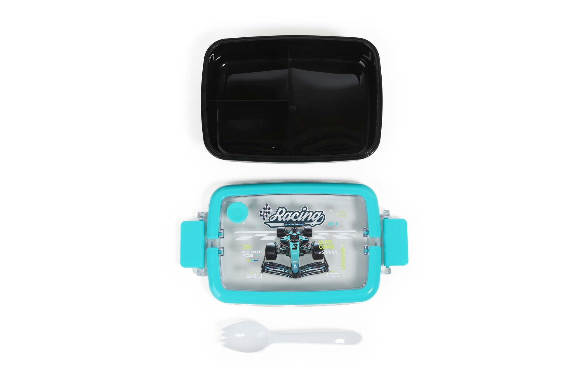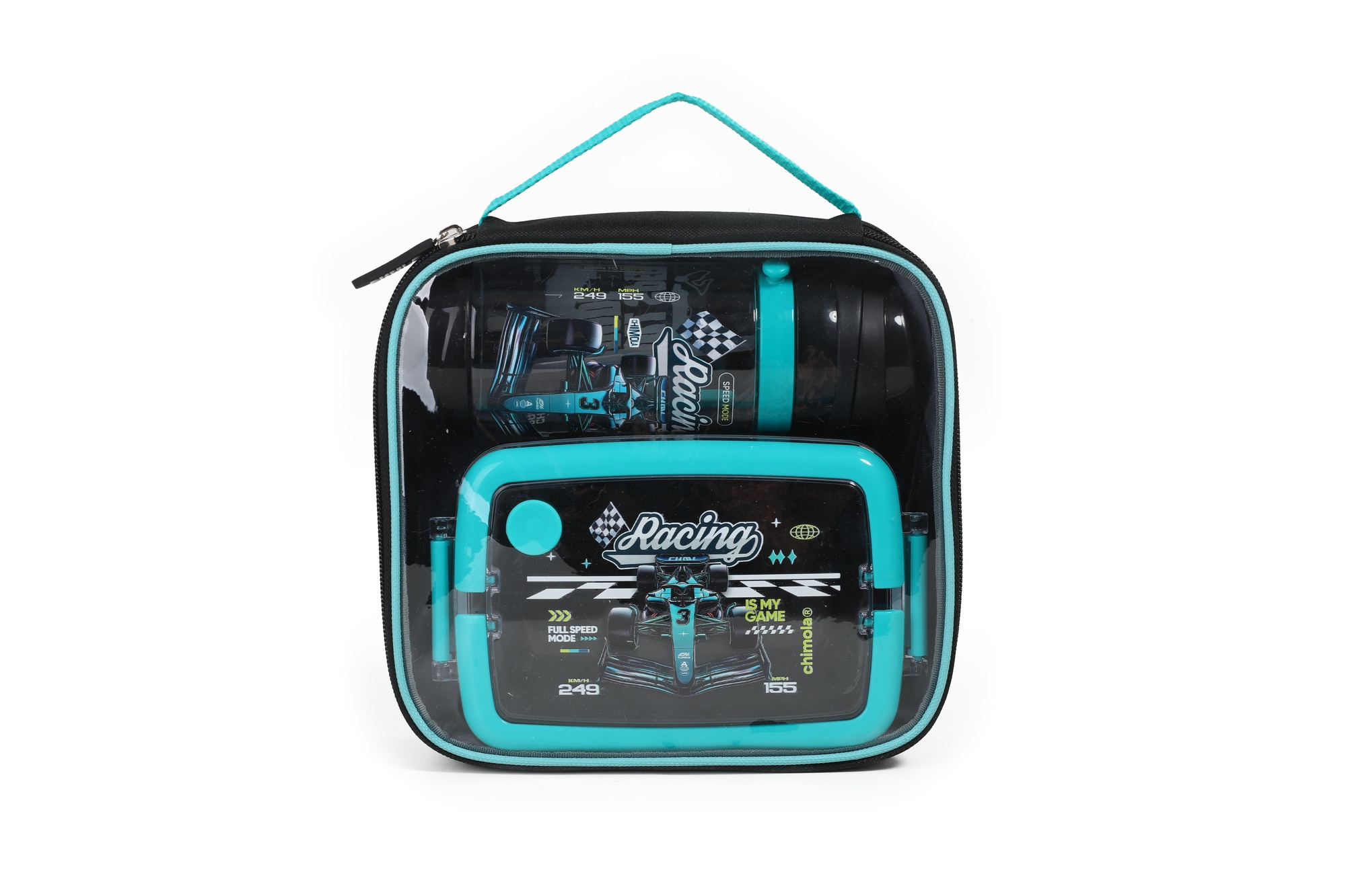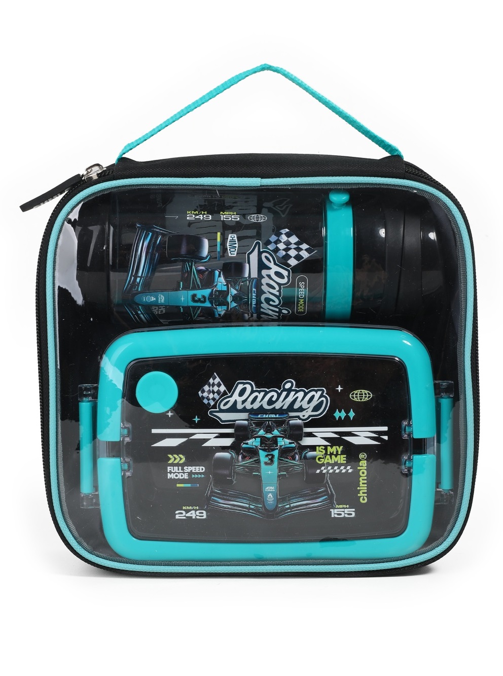 Ideal para lxs que aman la velocidad y la adrenalina. Con diseño de autos de carrera y detalles en azul eléctrico, este set está hecho para llegar primero. Este set escolar Chimola incluye lunchbox, botella y bolso transparente con manija en un packaging personalizado y lleno de onda. Es la solución práctica y divertida para llevar snacks e hidratación siempre a mano, con materiales resistentes y libres de BPA. El lunchbox cuenta con una tapa a presión con dos trabas de seguridad y divisiones internas que permiten organizar bien la comida. La botella tiene pico rÃgido, sorbete reutilizable, tapa abatible y correa ajustable. Todo se guarda en una bolsa compacta y resistente, ideal para transportar en la mochila o llevar en la mano.