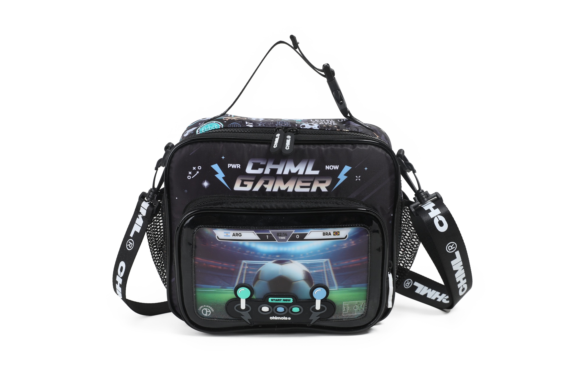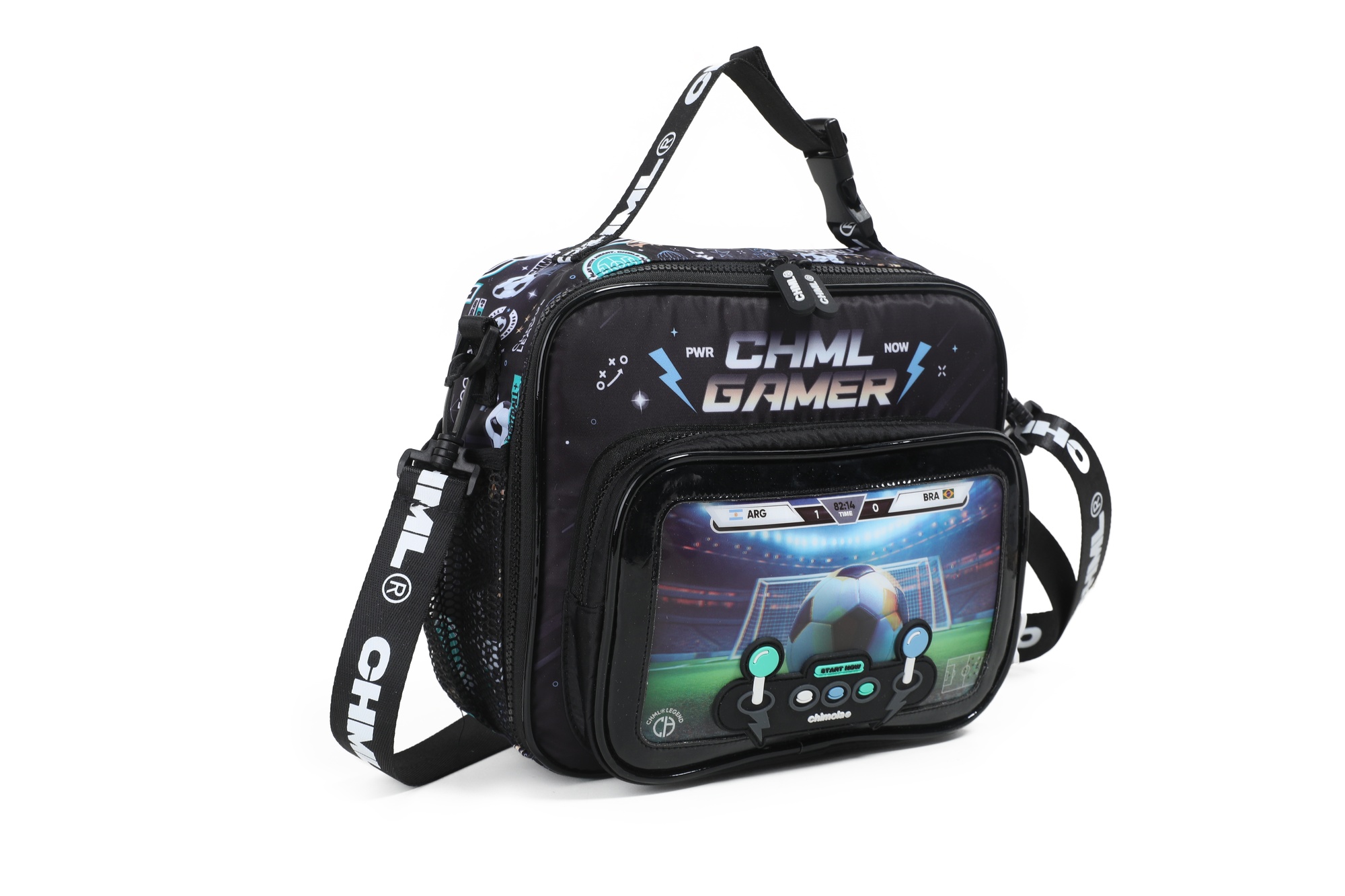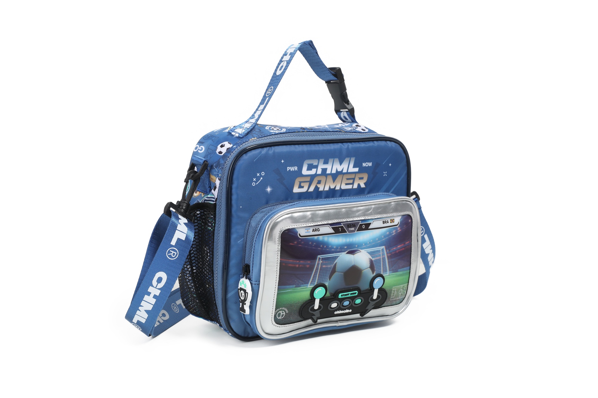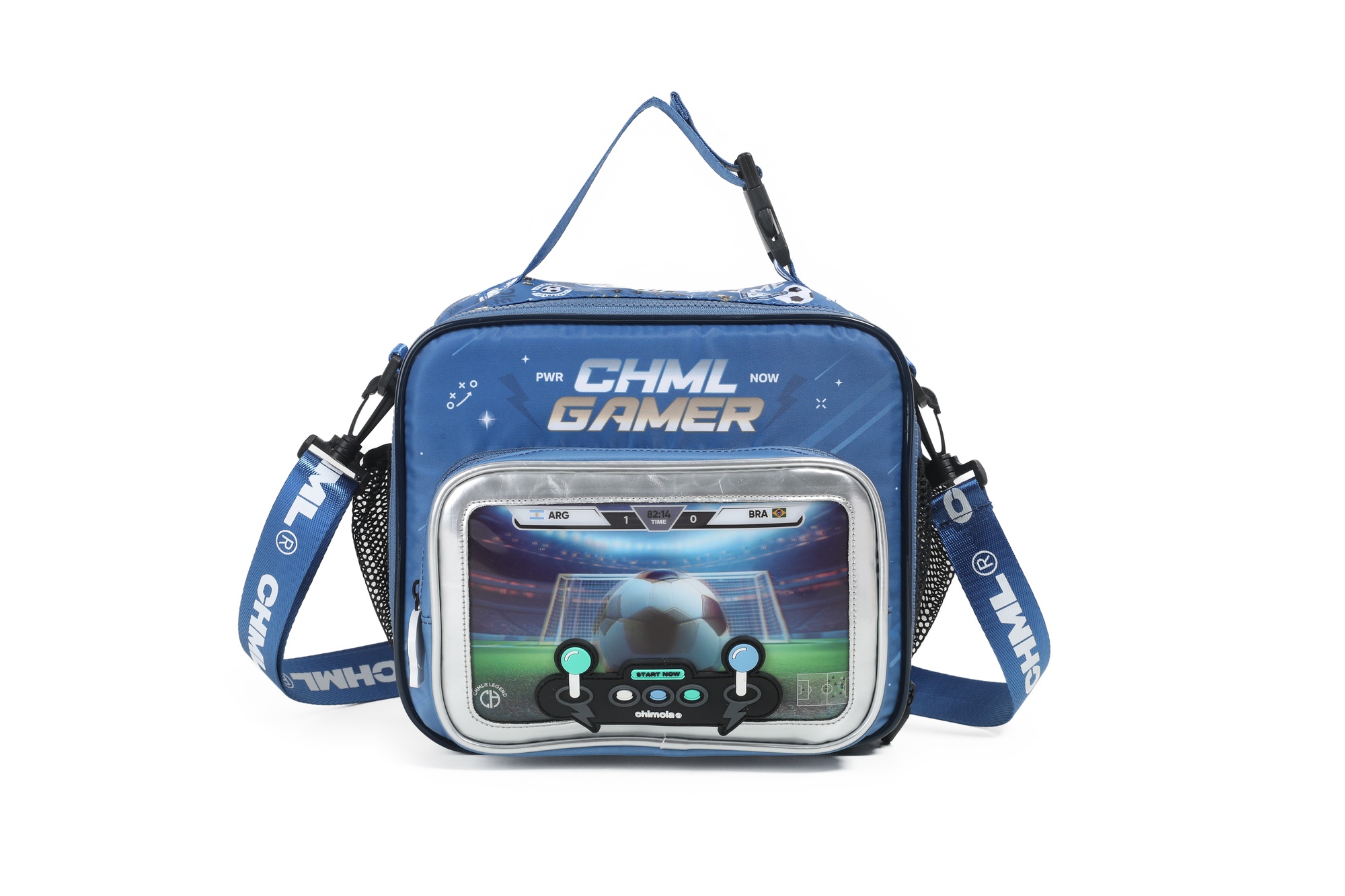 Lunchera gamer con diseño frontal en 3D que simula una consola: en versión fútbol o nave espacial. Interior térmico, bolsillo delantero amplio, laterales con red y correa regulable con gancho. ¡Ideal para los más fanáticos!