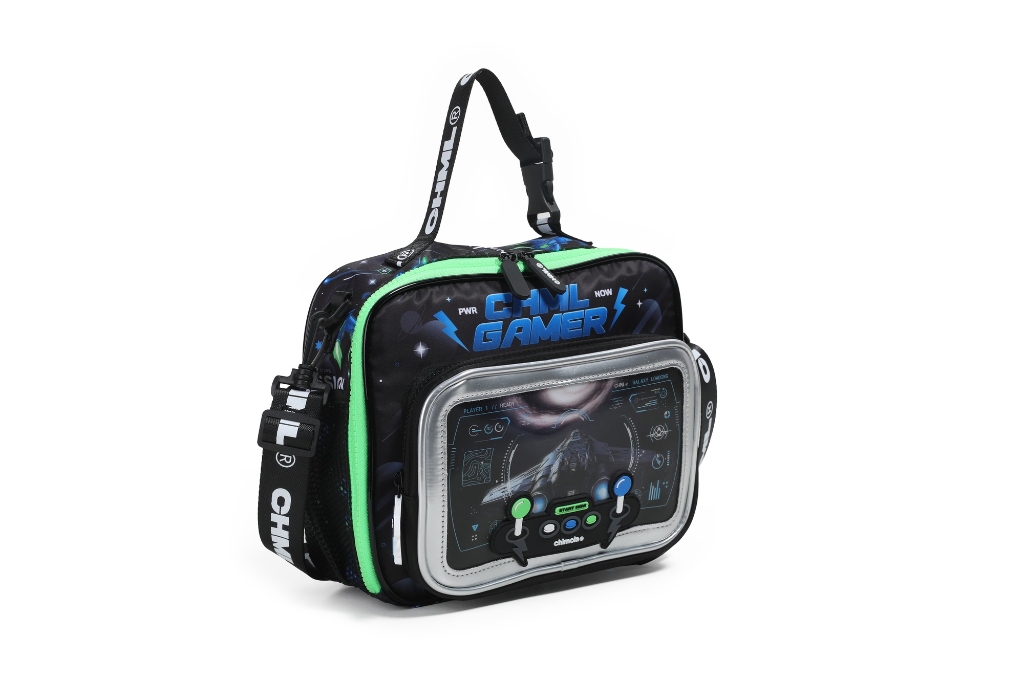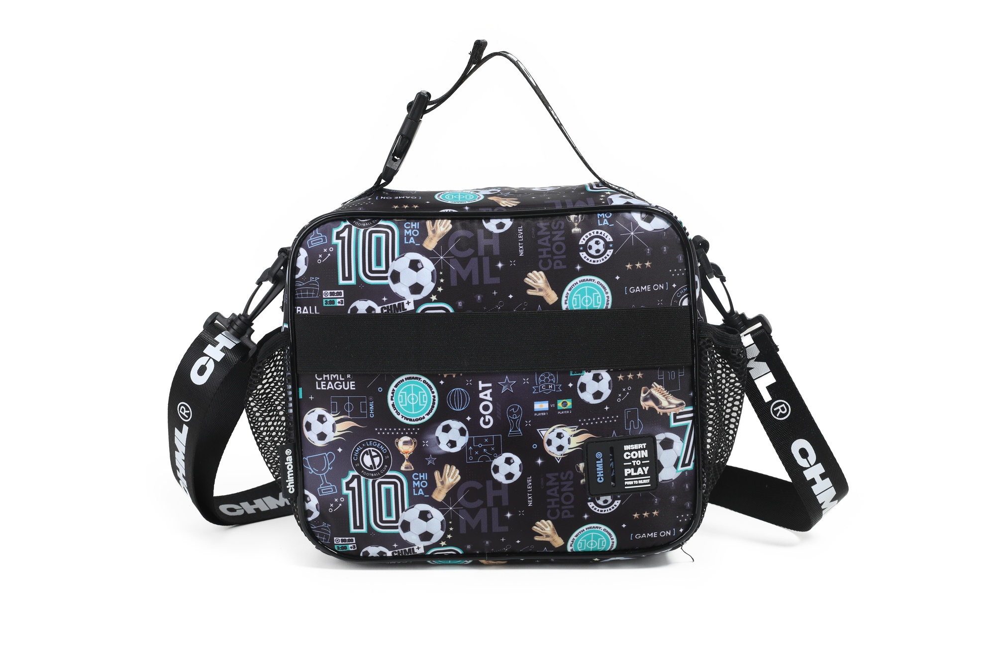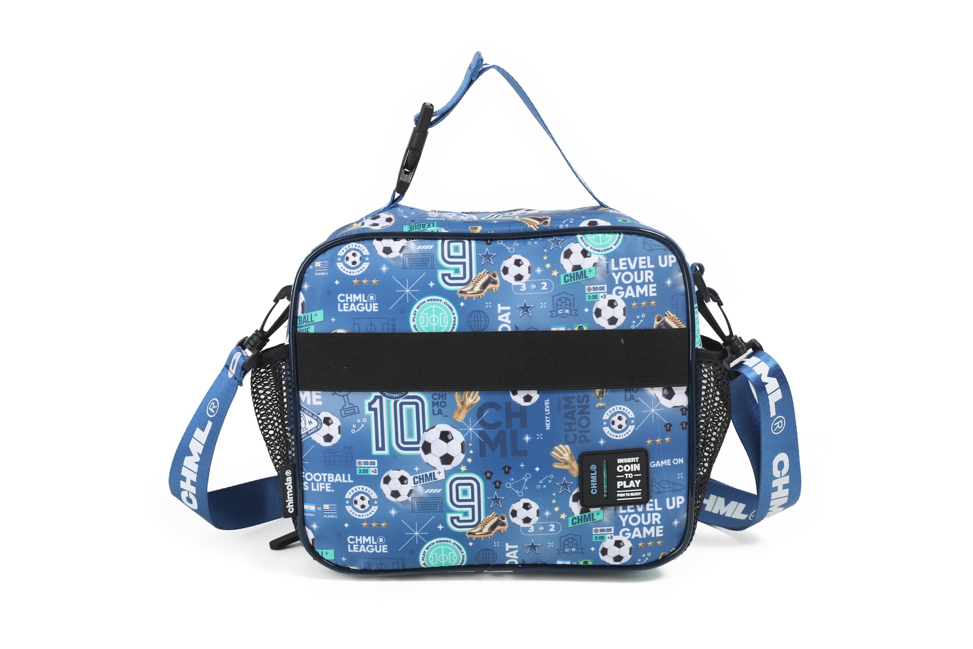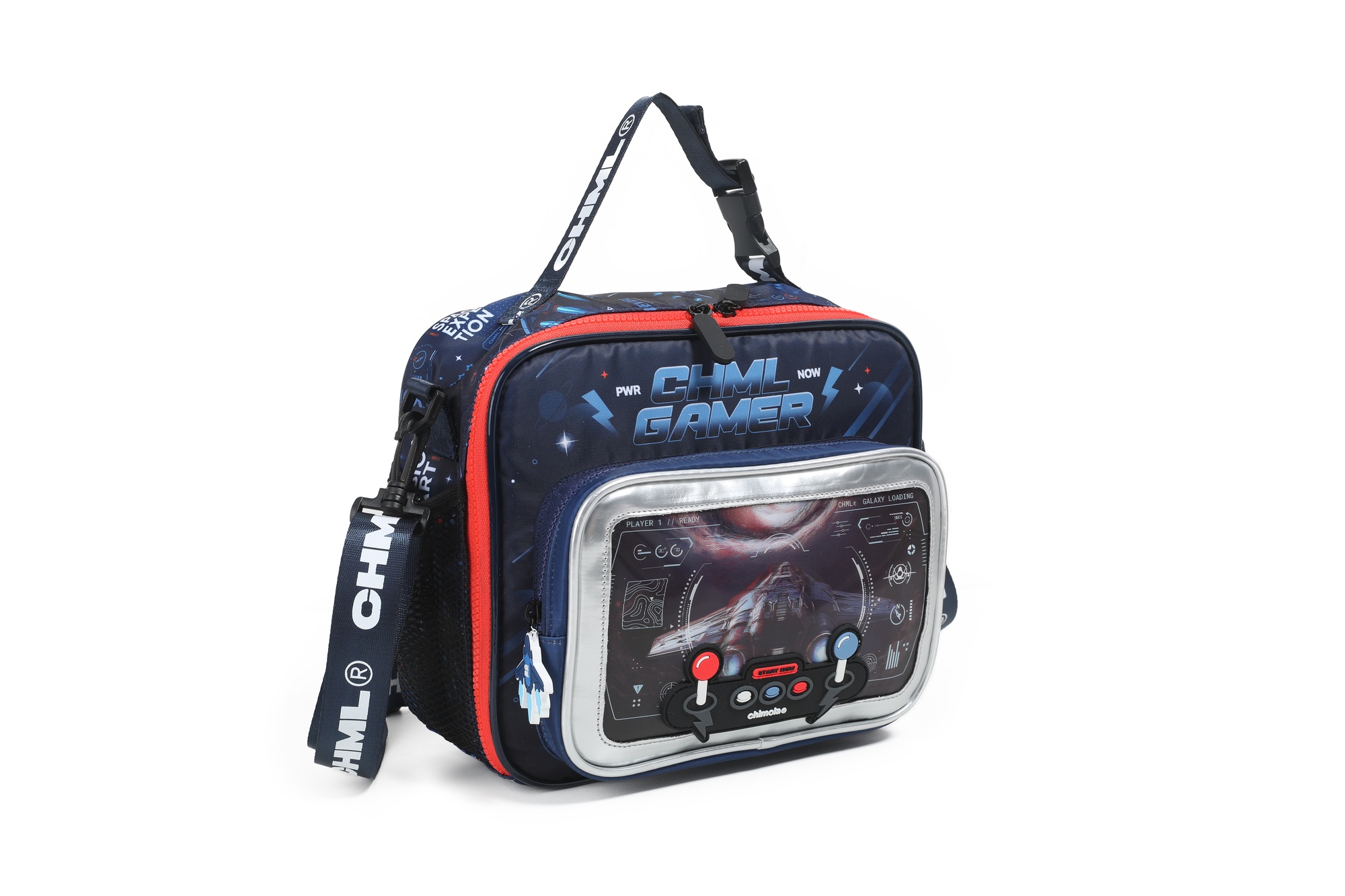 Lunchera gamer con diseño frontal en 3D que simula una consola: en versión fútbol o nave espacial. Interior térmico, bolsillo delantero amplio, laterales con red y correa regulable con gancho. ¡Ideal para los más fanáticos!