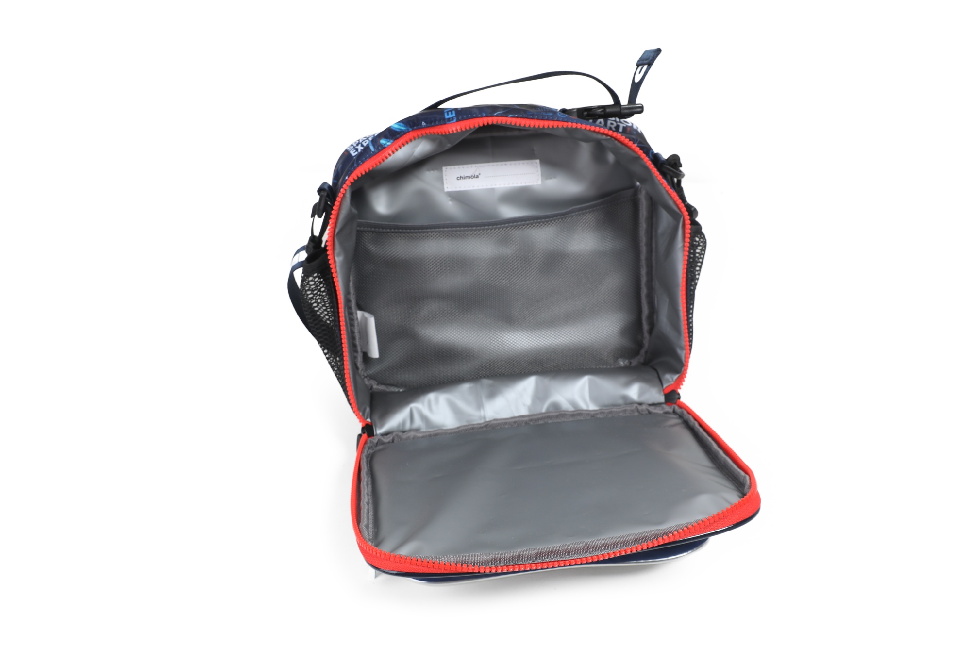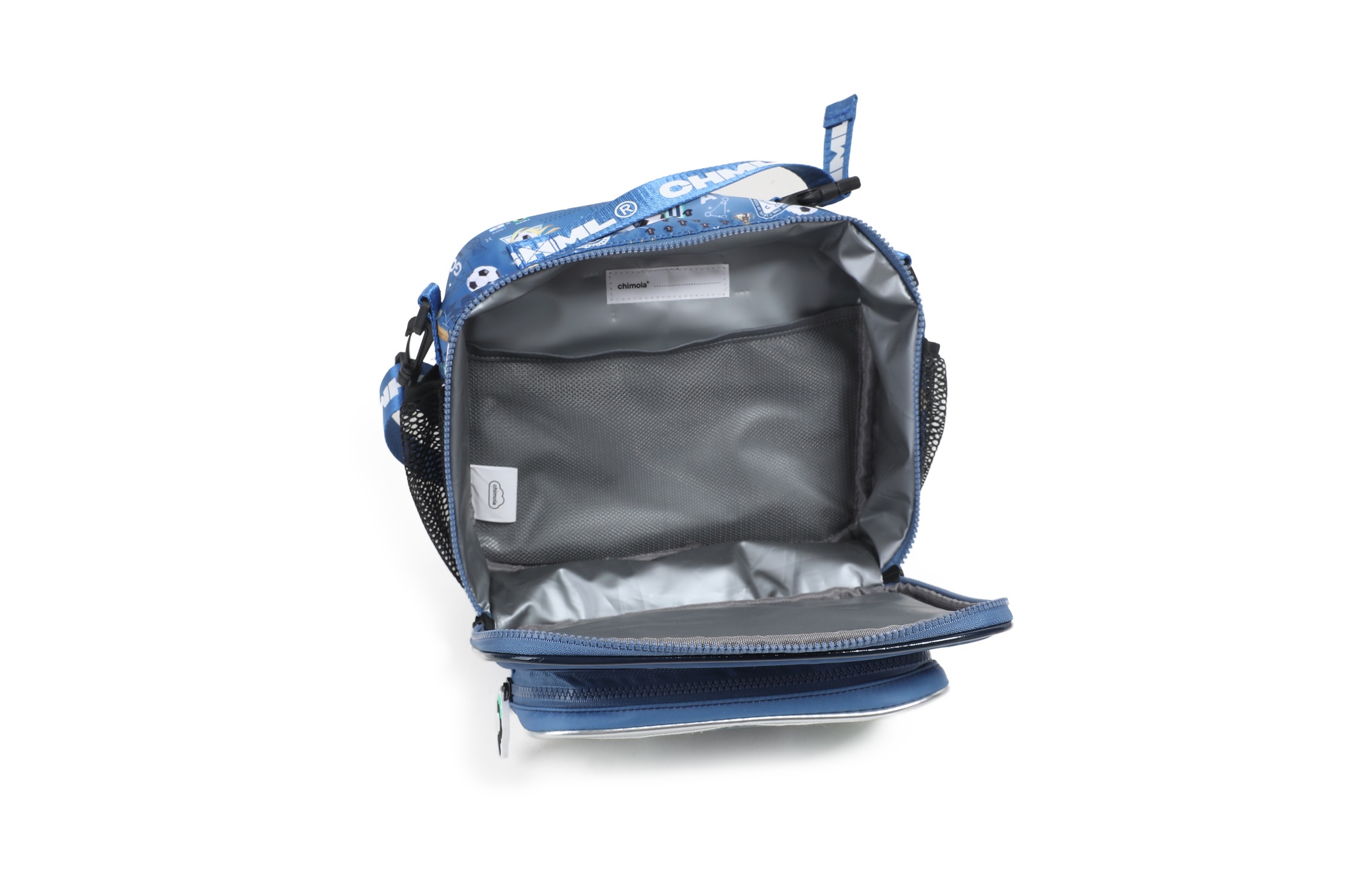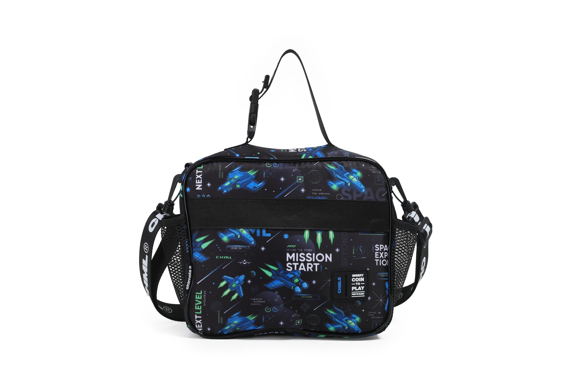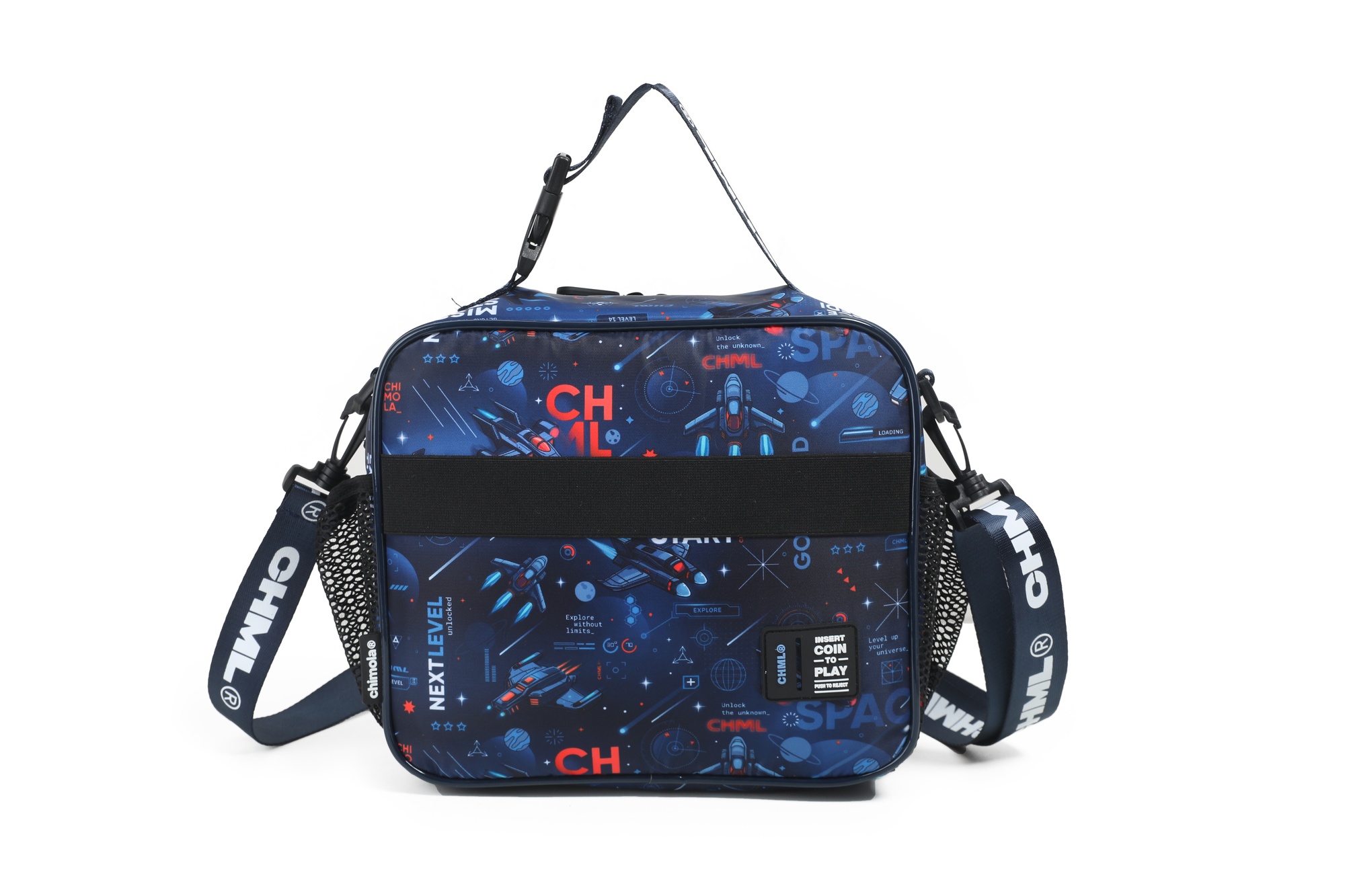 Lunchera gamer con diseño frontal en 3D que simula una consola: en versión fútbol o nave espacial. Interior térmico, bolsillo delantero amplio, laterales con red y correa regulable con gancho. ¡Ideal para los más fanáticos!