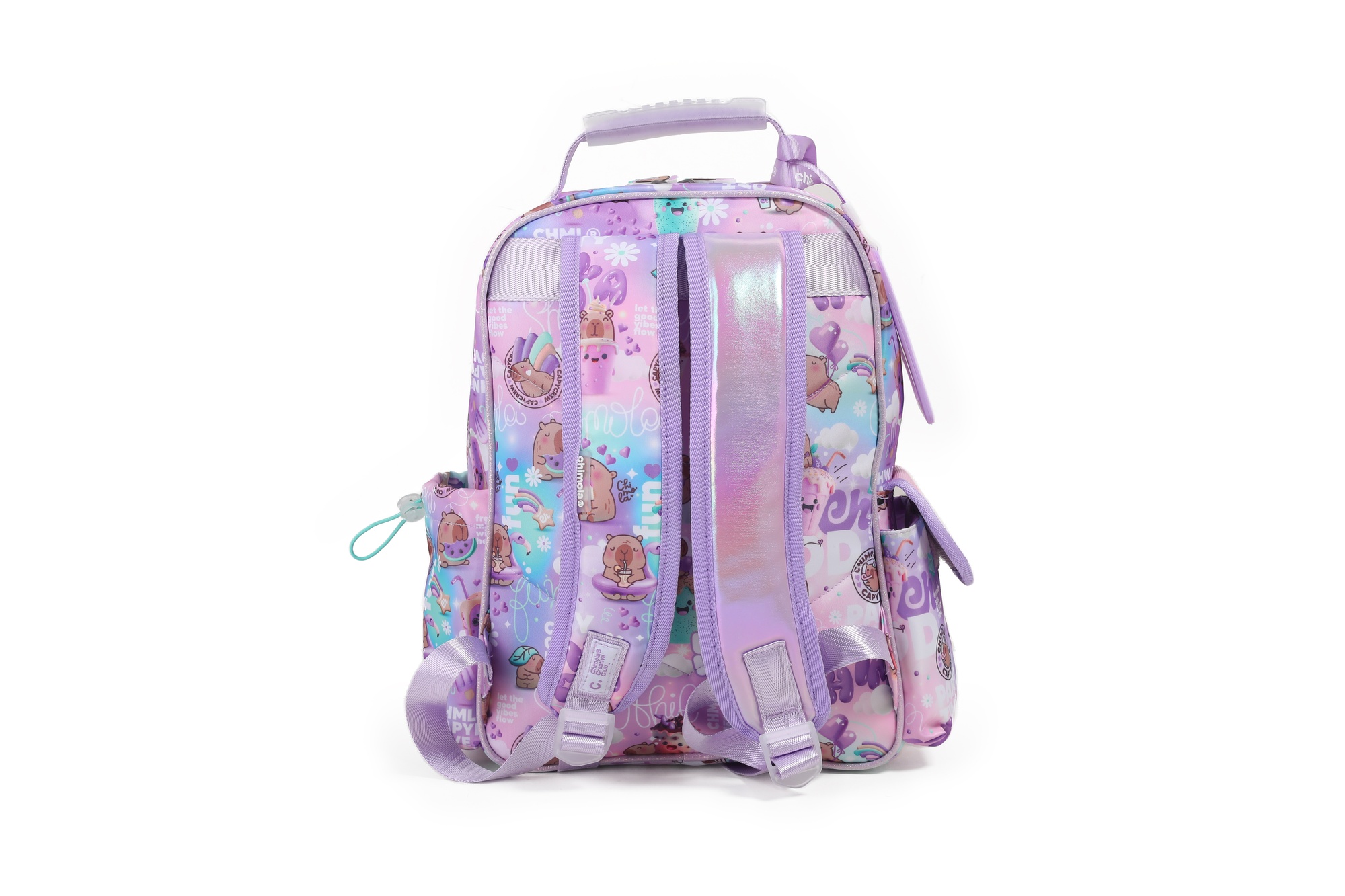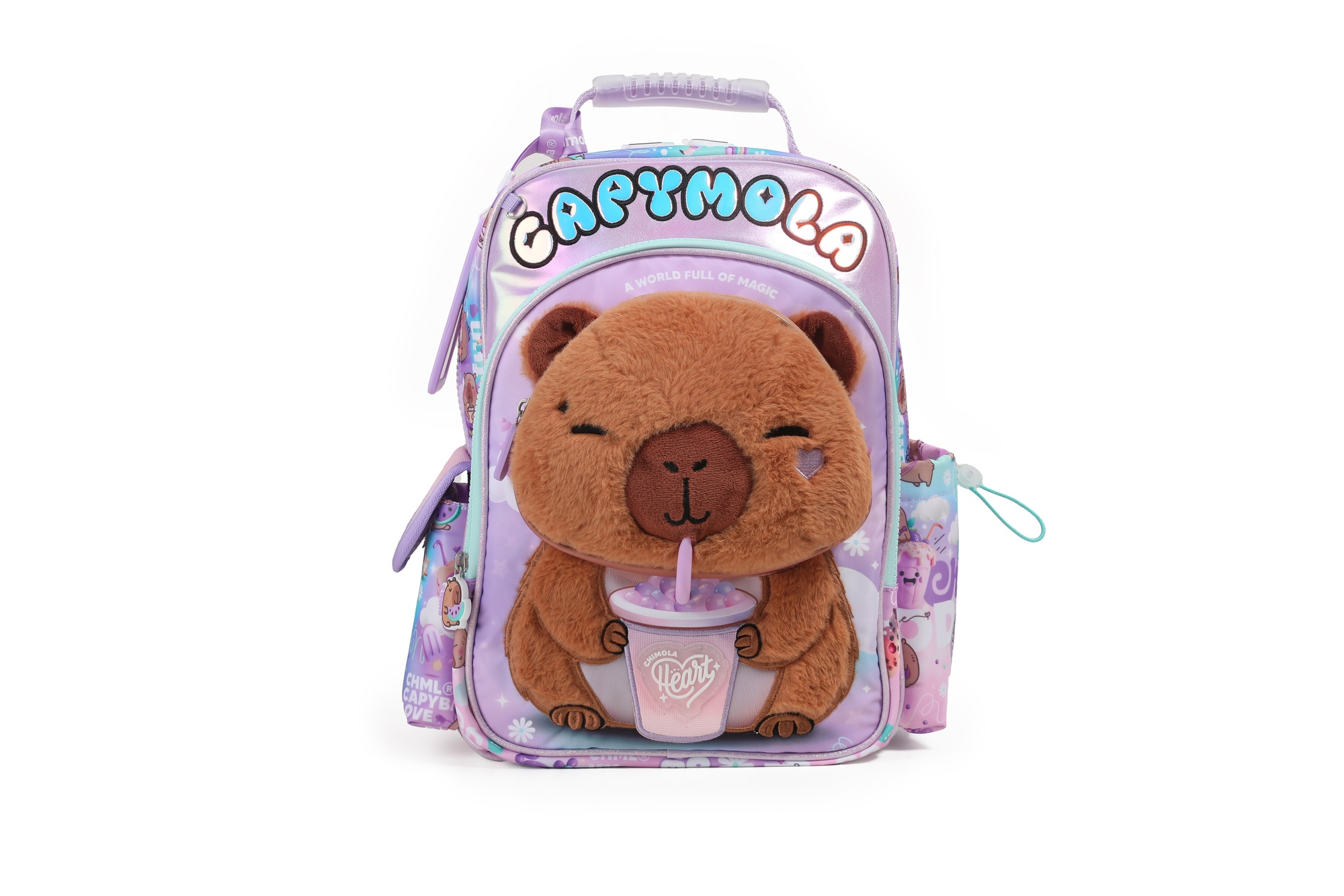 Capymola combina diseño y funcionalidad como ninguna otra. Tiene 2 compartimentos principales y un bolsillo frontal con volumen y detalles brillantes, inspirado en su mundo lleno de cielos, smoothies y tipografÃas lúdicas.