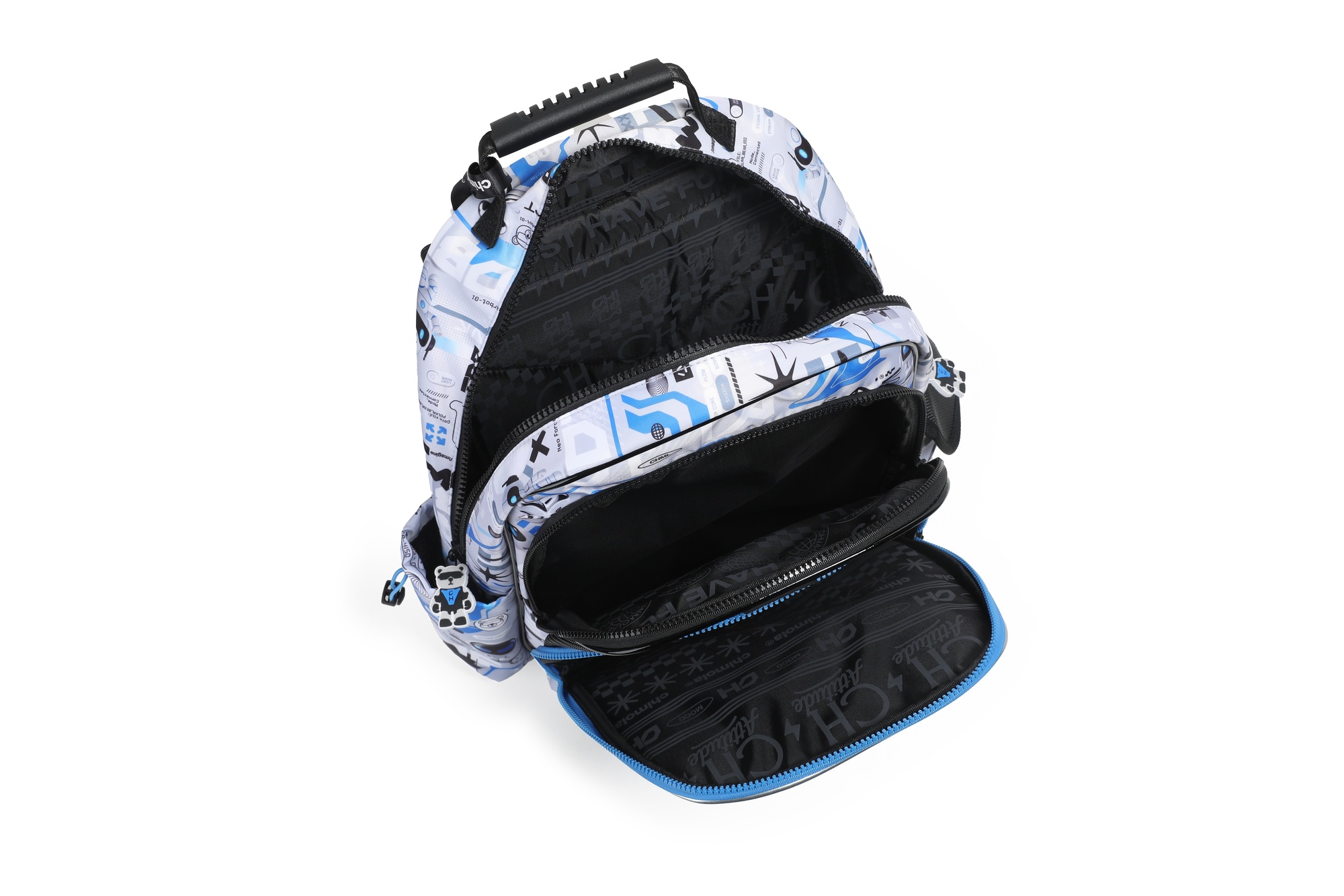 Cuenta con 2 compartimentos principales y un bolsillo frontal amplio con mezcla de materiales brillantes y mates que aportan contraste y un look robótico moderno. La estética tech, los niveles de relieve y la fusión de texturas hacen que no pase desapercibida.
