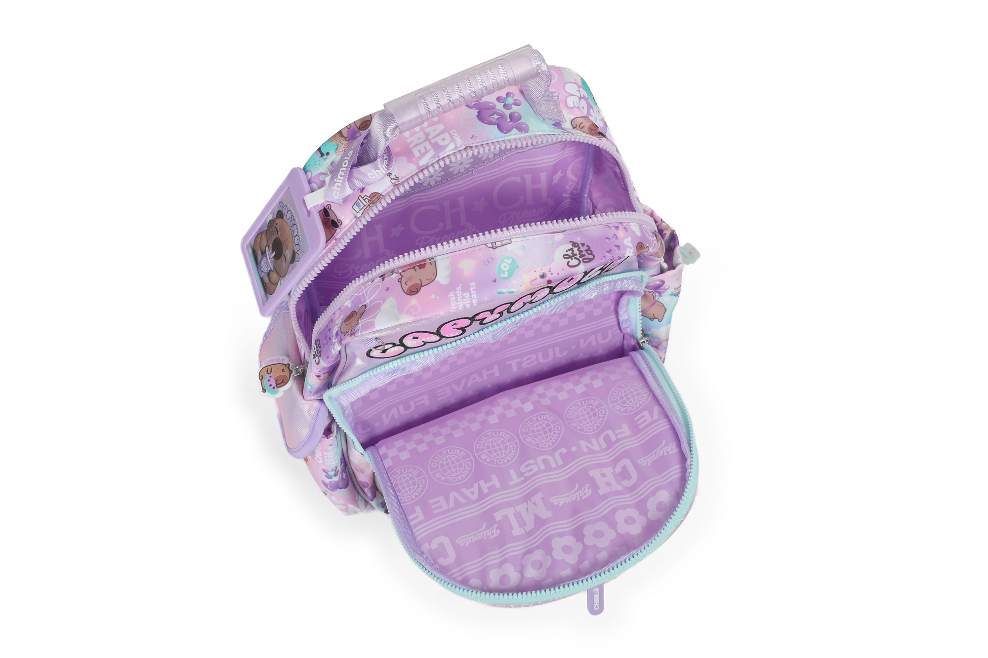 Los pullers de goma con el personaje, la paleta vibrante y el tag personalizado hacen de esta mochi una combinación perfecta entre organización y magia.