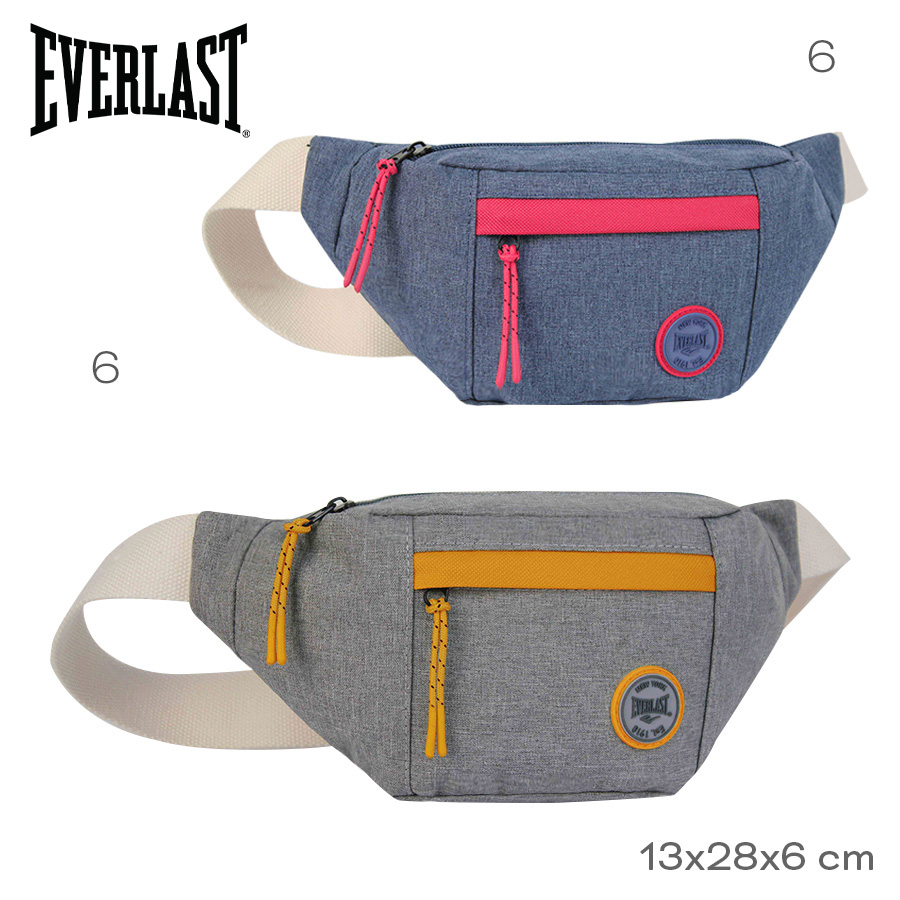 Descripción: Riñonera Everlast 27269. -Material: 100% Poliéster. -Medidas: 13 cm alto x 28 cm ancho x 6 cm profundidad. -Contiene: Un bolsillo principal, un bolsillo frontal, tira ajustable hasta 120 cm. -Interior forrado con el logo de la marca.