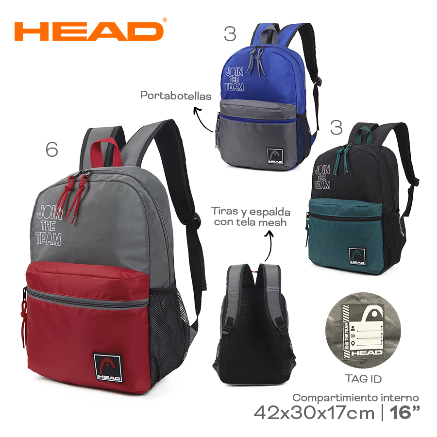 Descripción: Tiras y espalda con tela mesh. Portabotellas. Compartimiento interno. Medidas: 42 cm x 30 cm x 17 cm.