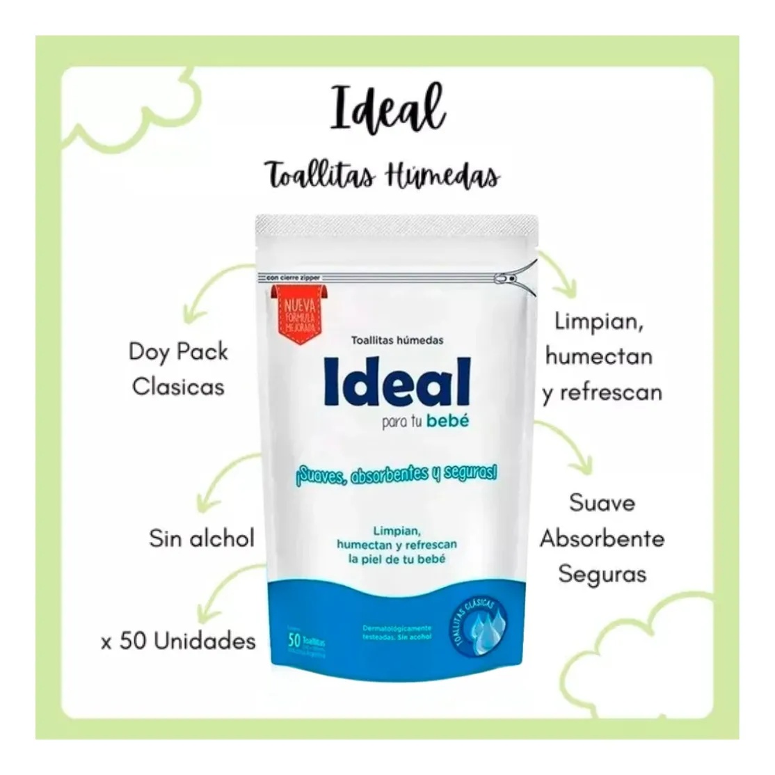 Descripción: Las Toallas Húmedas Ideal Clásicas vienen en un práctico Doy Pack que contiene 50 unidades. Estas toallitas son ideales para la higiene y el cuidado personal, proporcionando una limpieza suave y efectiva.