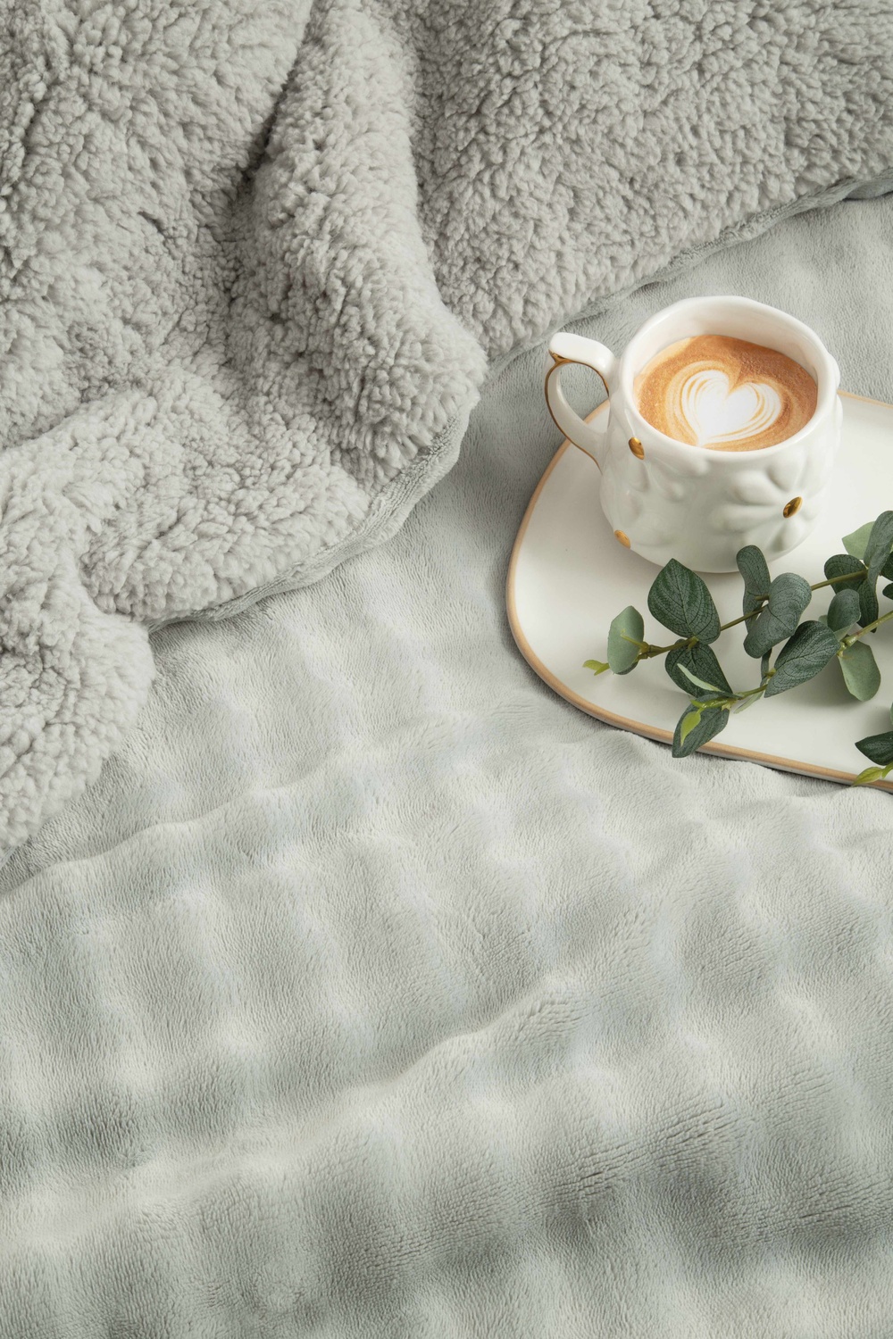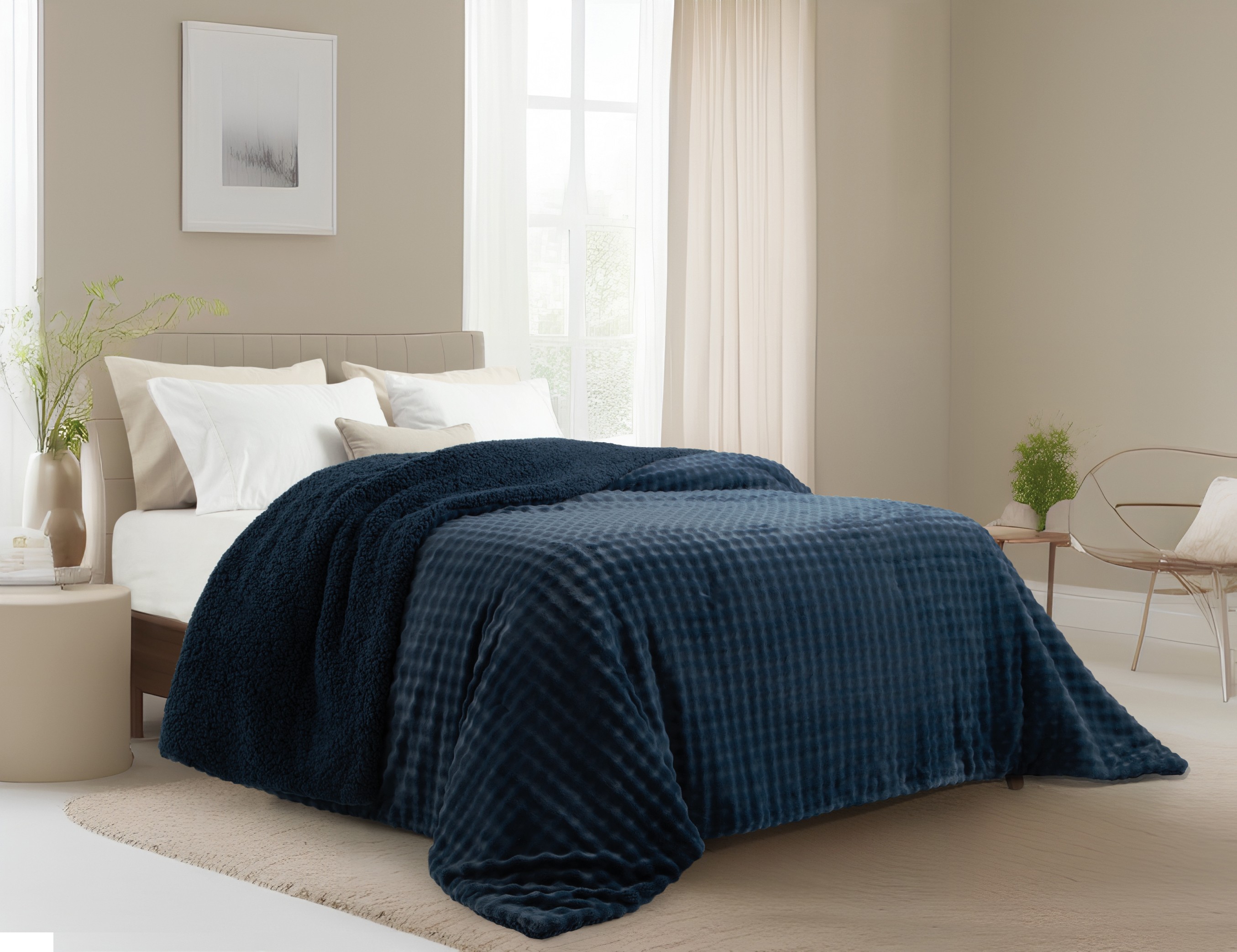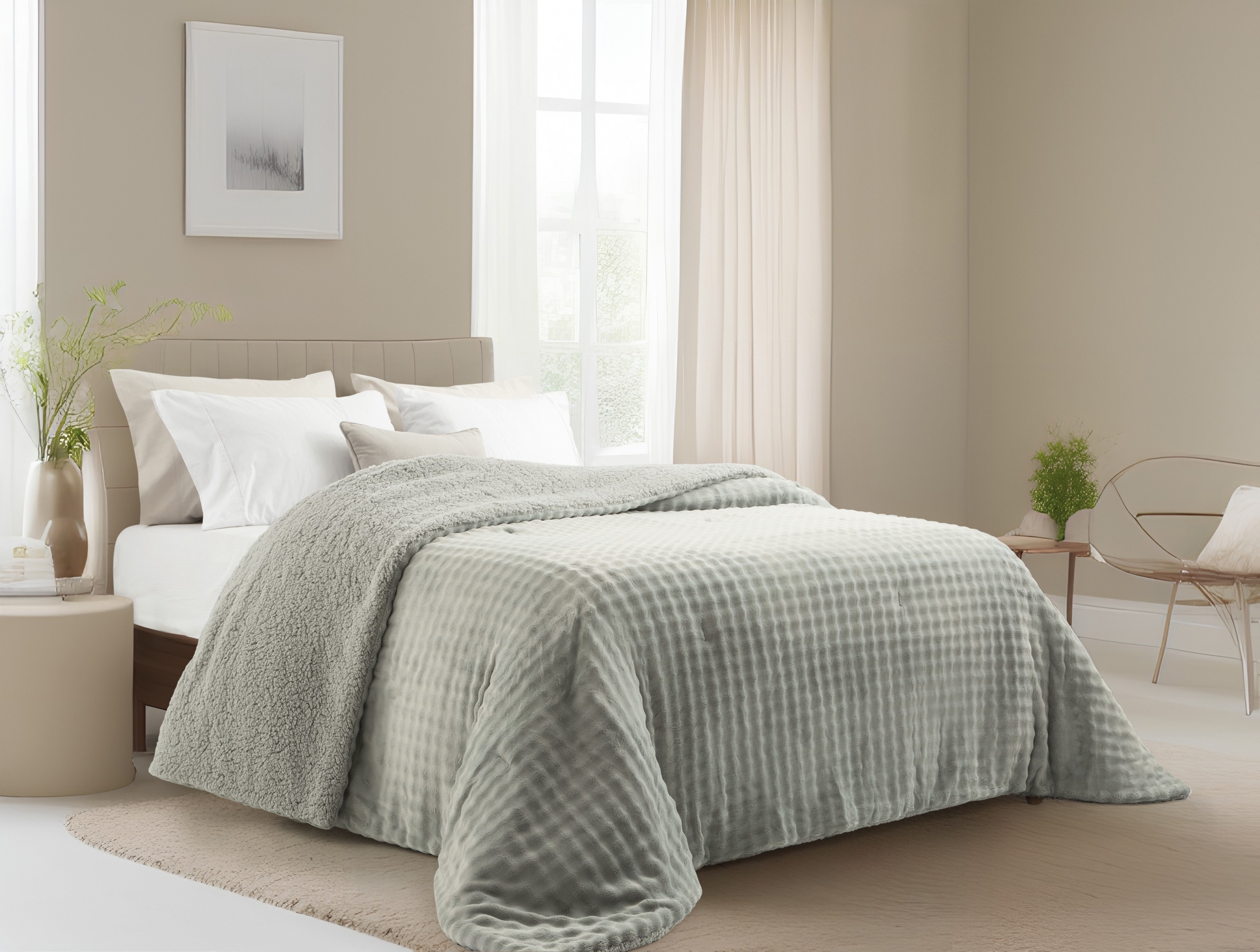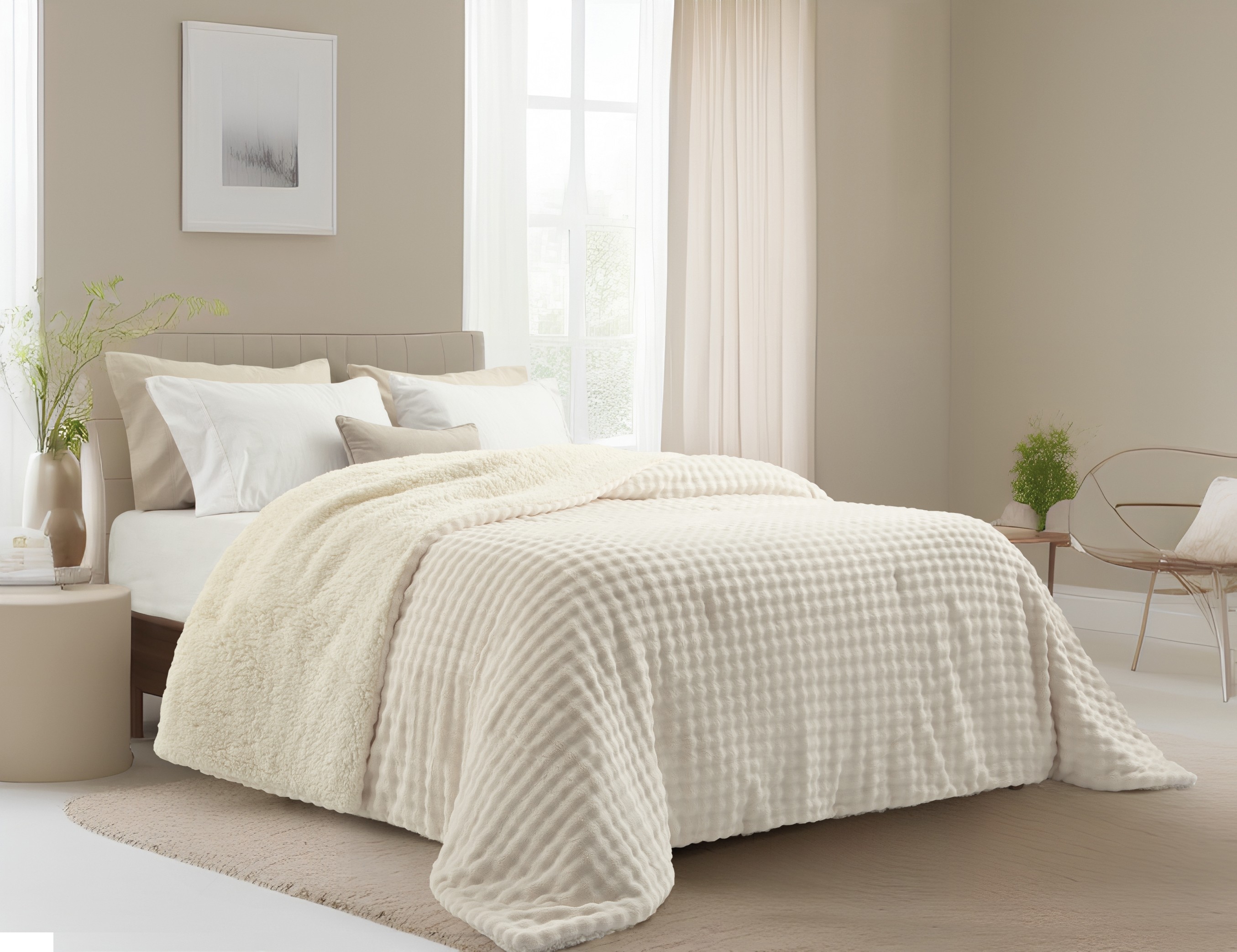 Descripción: Medidas: Ancho x Largo 280 cm x 240 cm. Composición: 100% poliéster. Materiales externos: Flannel fleece. Edredón matelaseado de flannel fleece bubble con efecto de ondas 3D y reverso de corderito.