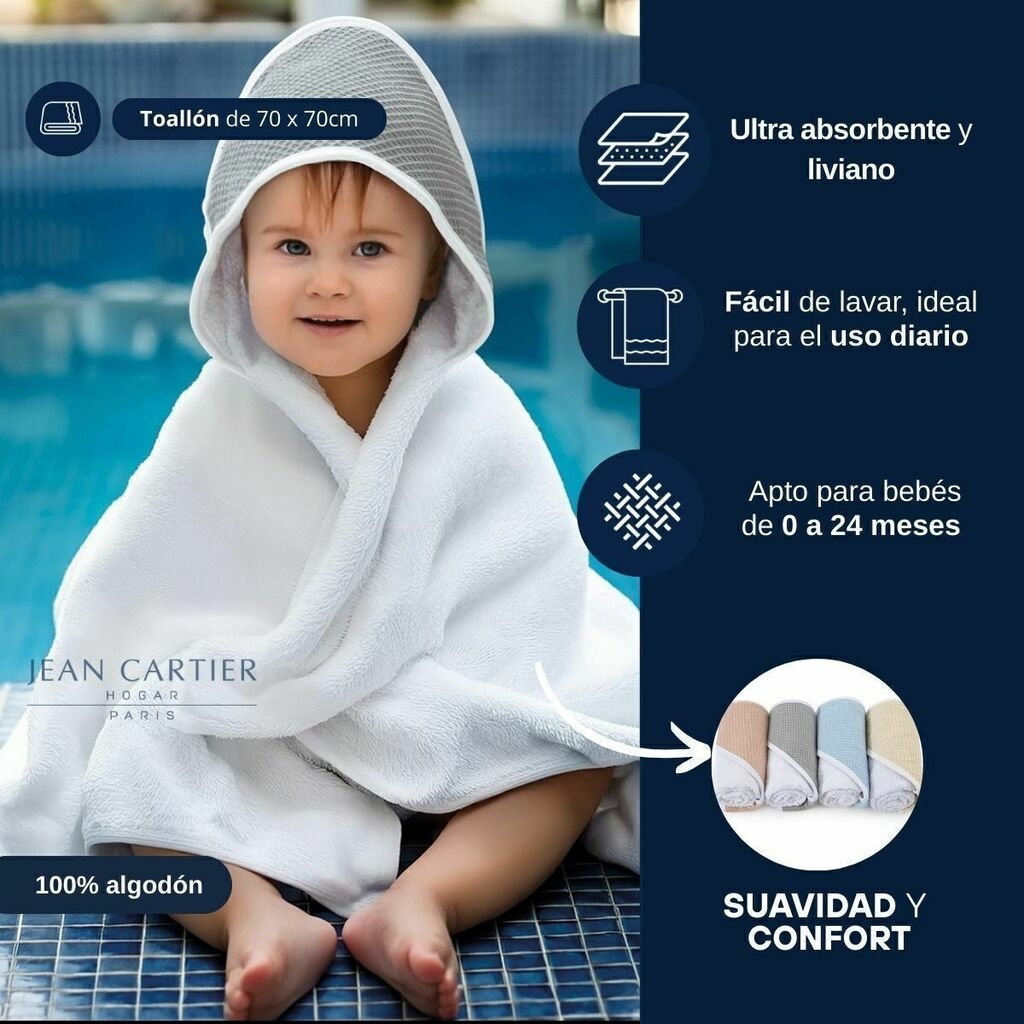 Descripción: Presentamos el Toallón de Bebé con Capucha Tejida 100% Algodón de Jean Cartier, una elección ideal para mimar a tu pequeño después del baño. Este toallón cuenta con un suave tejido de nido de abeja, que proporciona una textura agradable al tacto, mientras que el ribete blanco le añade un toque de elegancia. Con medidas generosas de 70 x 70 cm, es perfecto para envolver a tu bebé con calidez y comodidad. Su composición en 100% algodón asegura que es amigable con la piel sensible de los bebés. Además, la capucha incorporada brinda un extra de calor y protección, convirtiéndolo en un accesorio fundamental para el cuidado de tu bebé. Es la opción perfecta para hacer de cada baño una experiencia agradable y reconfortante.