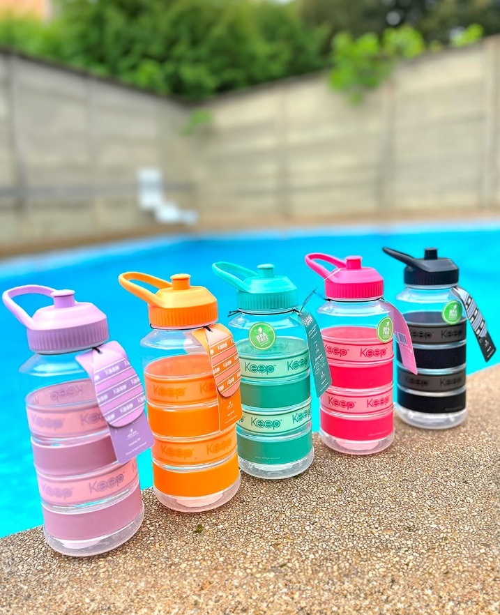 Descripción: BOTELLA PP 1 LITRO ANTI DERRAME Y BANDAS DE SILICONA ANTIDESLIZANTE TAPA ROSCA Y BOQUILLA LIBRE DE BPA