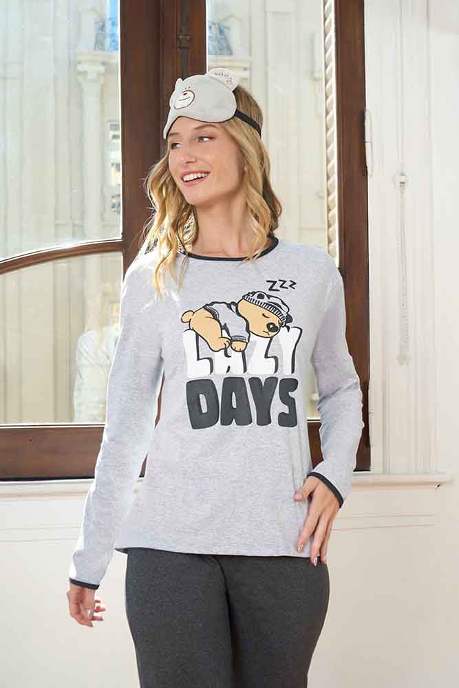 Descripción: Pijama de mujer, confeccionado en jersey de algodón, remera manga larga con estampa en frente y pantalón liso.