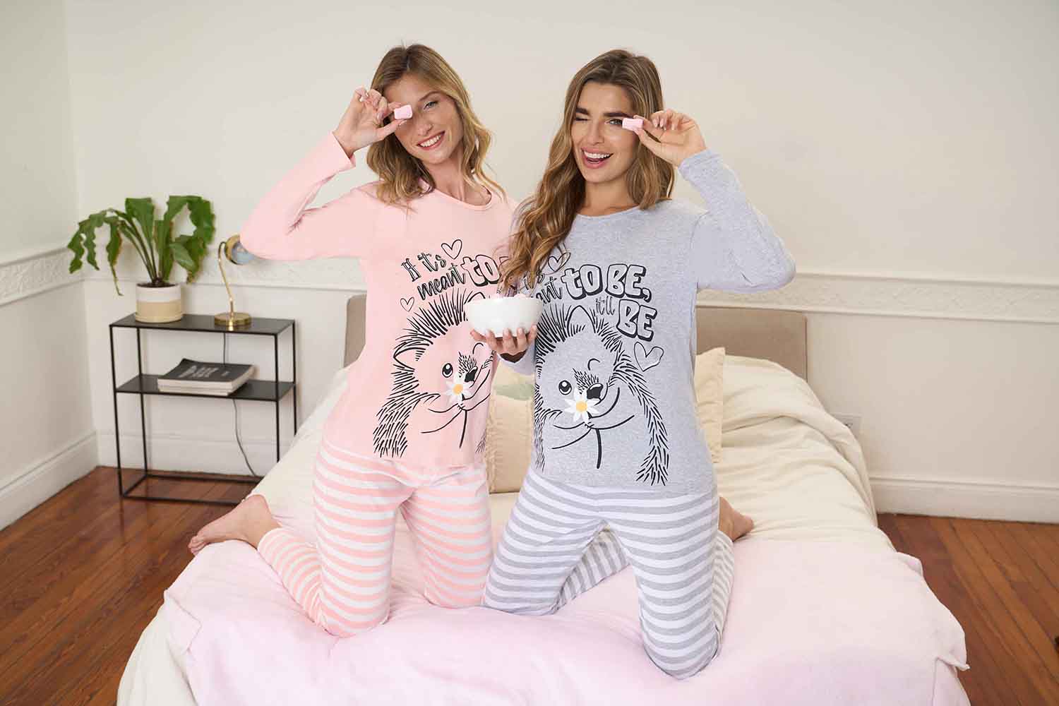 Descripción: Pijama en Jersey. Remera manga larga, cuello redondo, lisa con estampa al frente; pantalón rayado.
