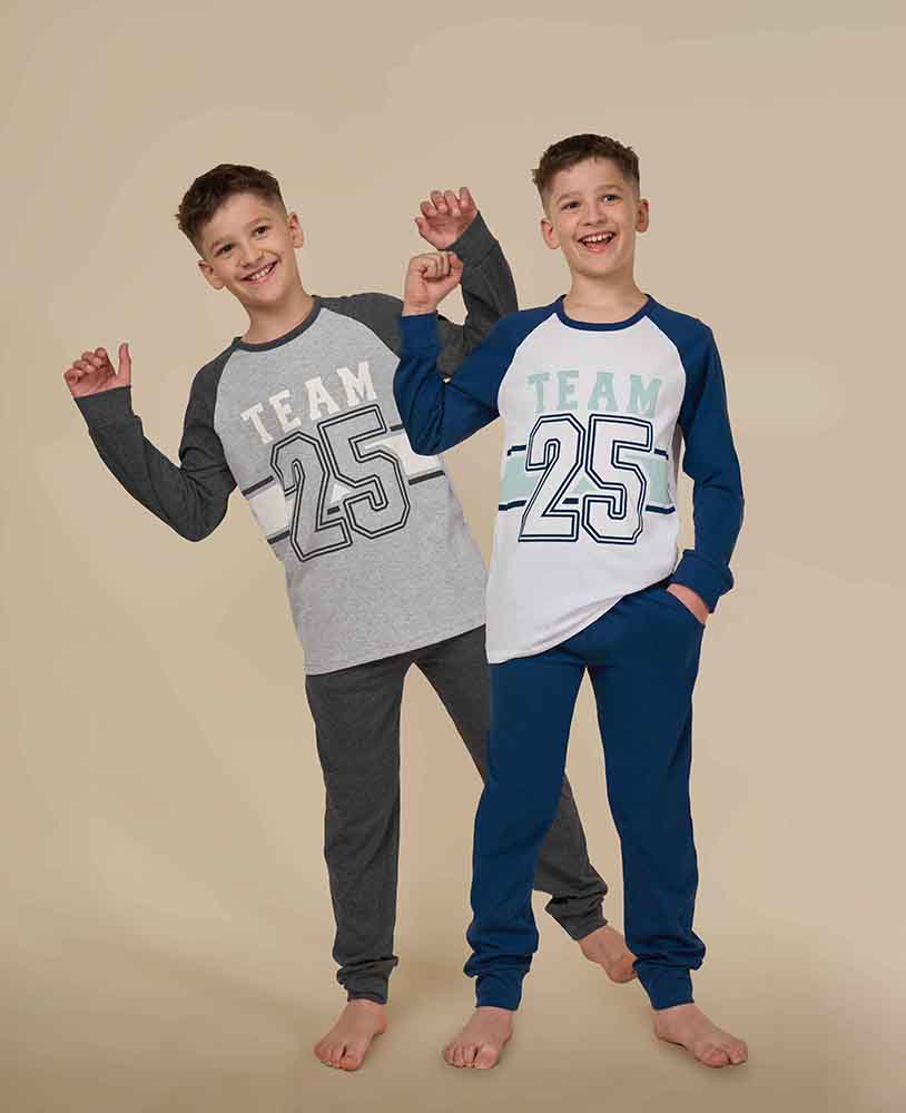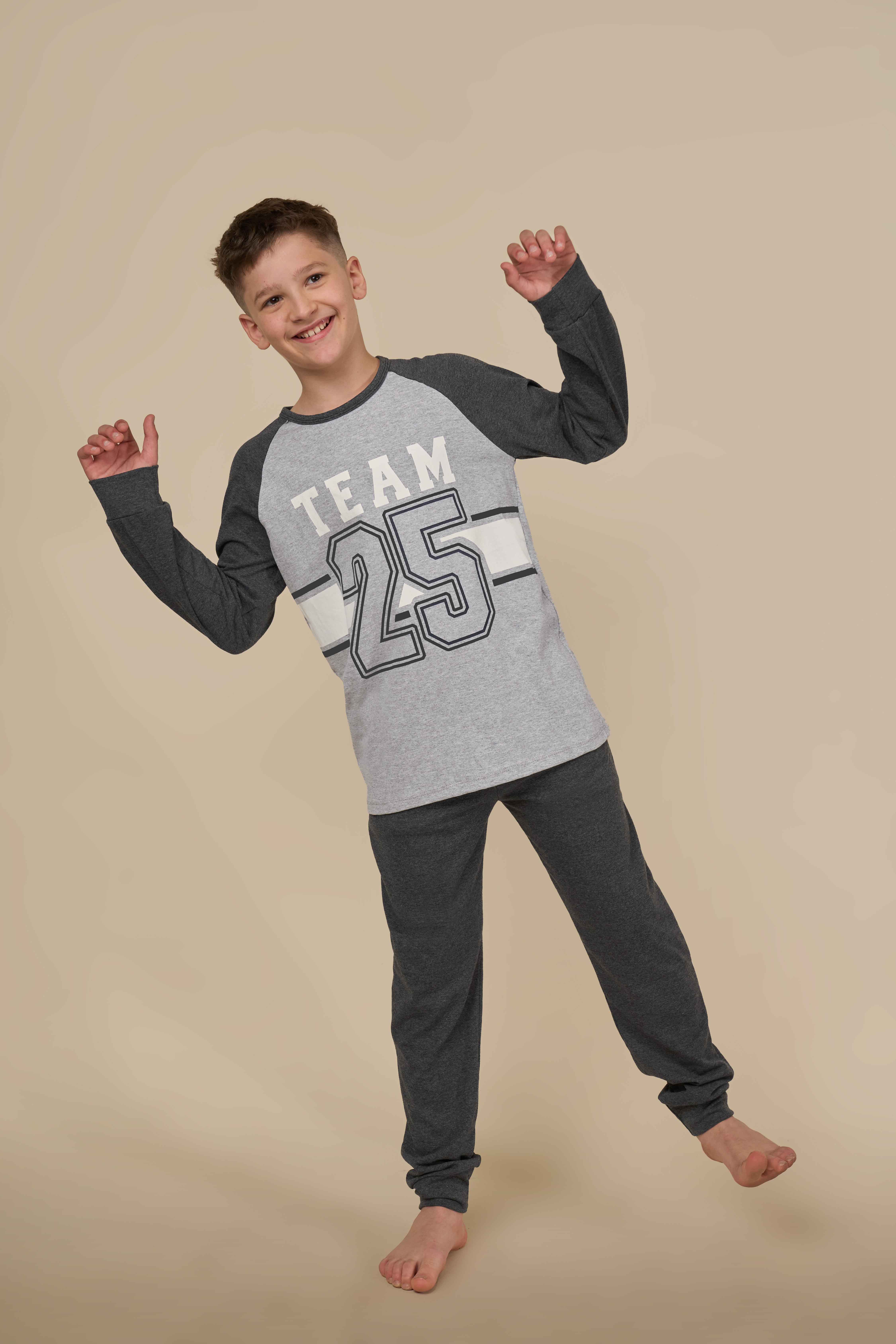 Modelo con remera manga larga con diseño y pantalon largo con puño. Ambas prendas son de algodón.