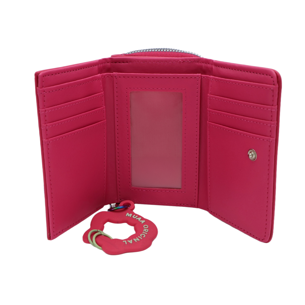 Descripción: -Material: 100% PU. -Medidas: 9cm alto x 12cm ancho x 5cm profundidad. -Contiene: Bolsillo principal con cierre, dos compartimientos organizadores, siete para tarjetas y uno para billetes. -Incluye llavero.