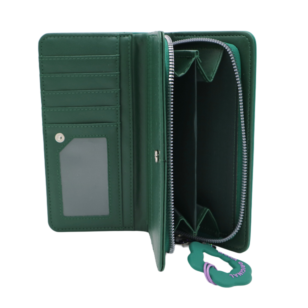 Descripción: Material: 100% PU. -Medidas: 9cm alto x 19cm ancho x 3cm profundidad. -Contiene: Bolsillo principal con cierre, tres compartimientos organizadores y once para tarjetas. -Incluye llavero.