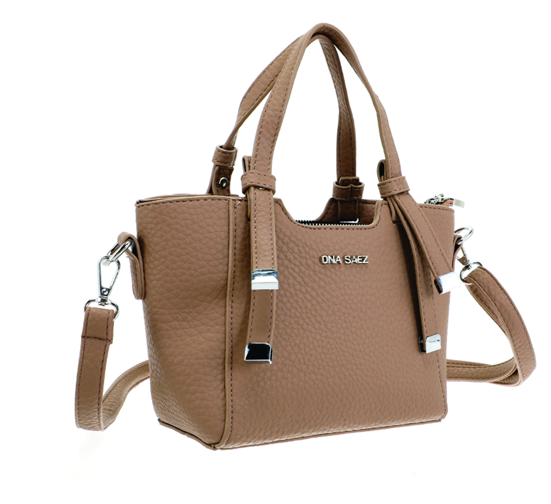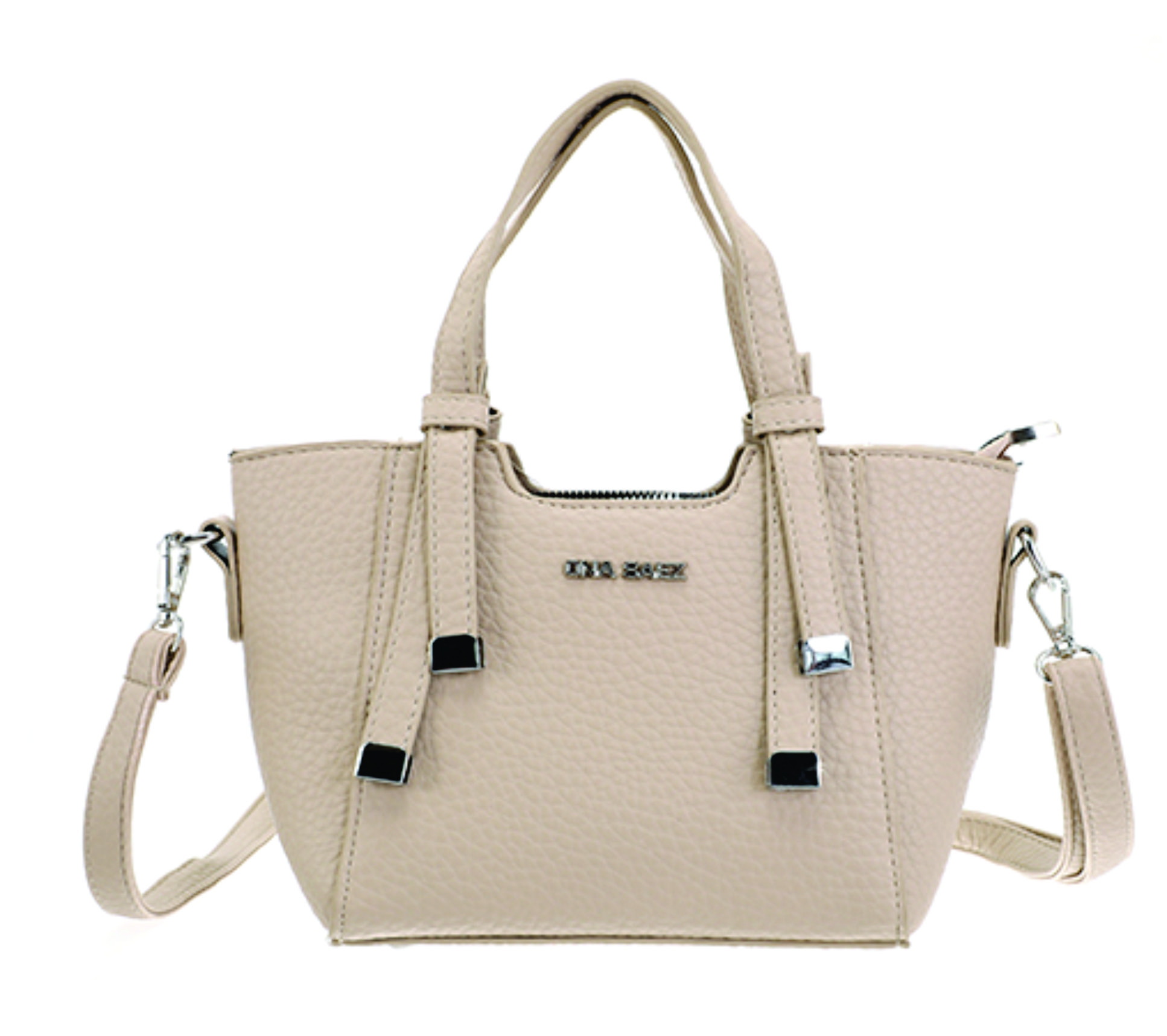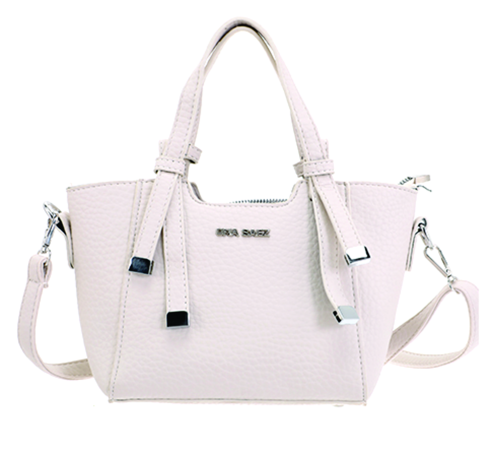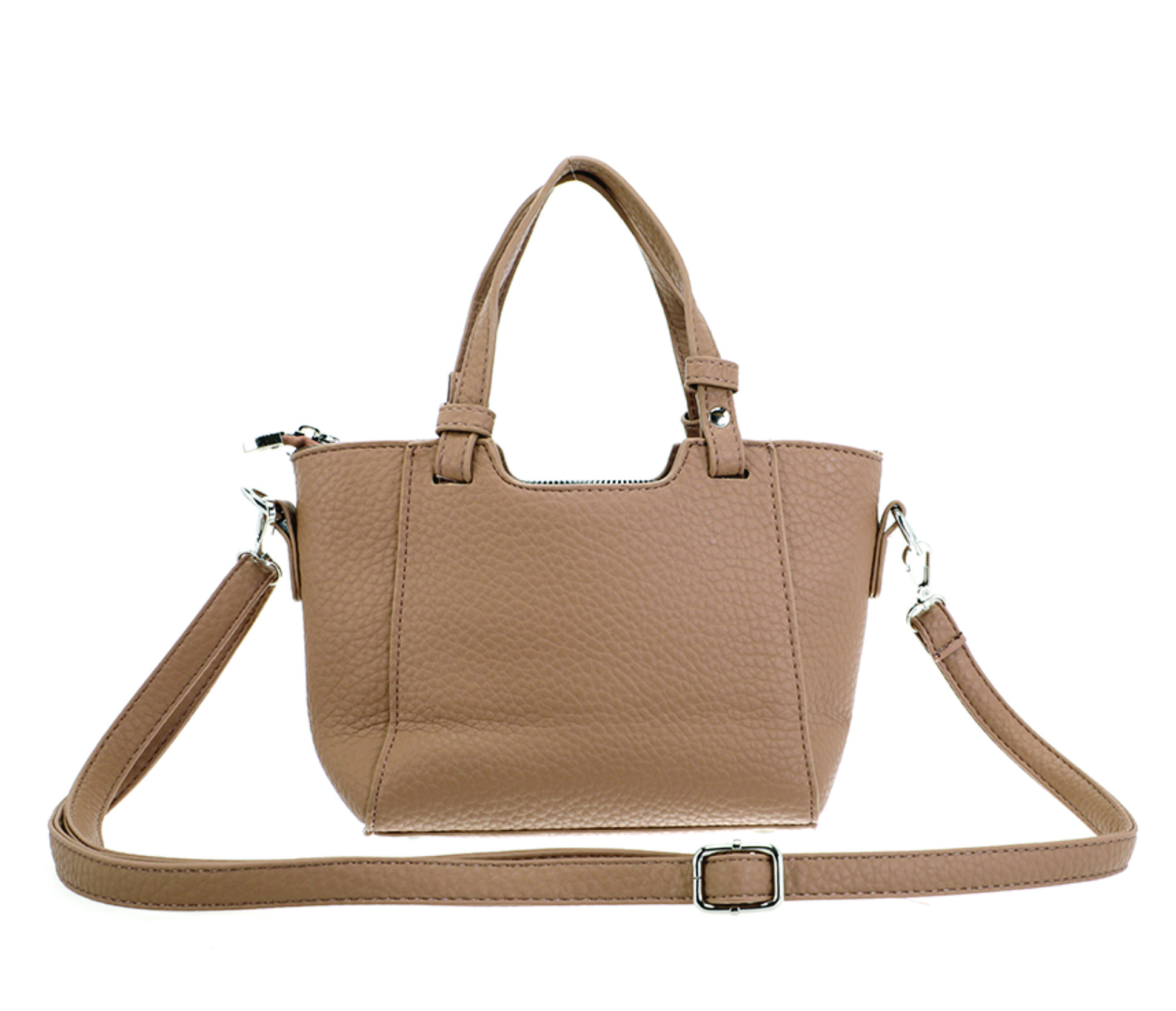 Mini cartera tipo tote bag confeccionada en material sÃmil cuero con textura graneada. Su diseño estructurado y moderno se destaca por las manijas cortas rÃgidas y la correa larga regulable y desmontable, que permite llevarla cruzada o al hombro.