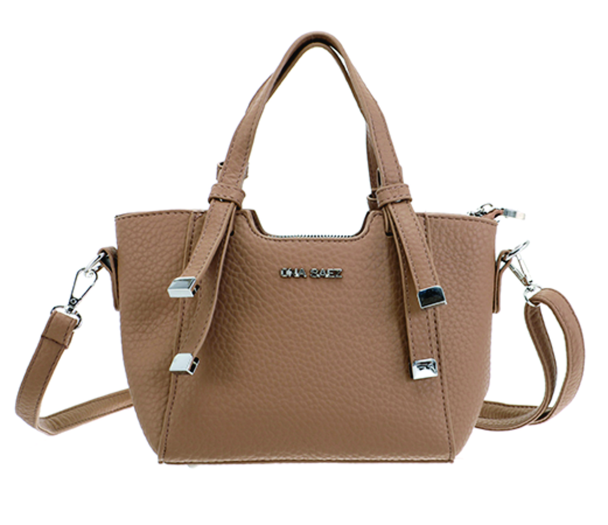 Cuenta con cierre superior metálico, herrajes plateados y detalle de tiras frontales con punteras metálicas, aportando un toque sofisticado y contemporáneo.
