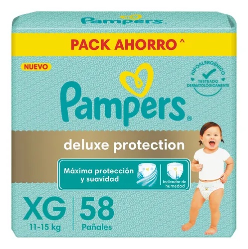 Pampers Deluxe Protection cuenta con la máxima absorción y suavidad de Pampers para proteger delicadamente la piel de tu bebé. Además cuenta con indicador de humedad para saber cuando es el momento del cambio, materiales ultra respirables para que la piel de tu bebé se mantenga sequita, ayuda a prevenir irritaciones y son hipoalergénicos. Probá la nueva versión de Pampers Deluxe Protección y dale a tu bebé la más suave protección de Pampers.