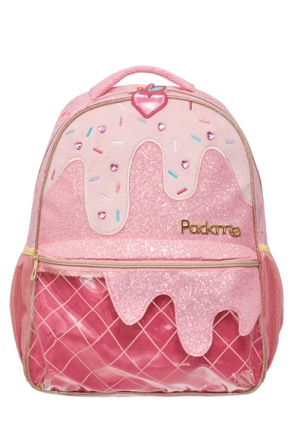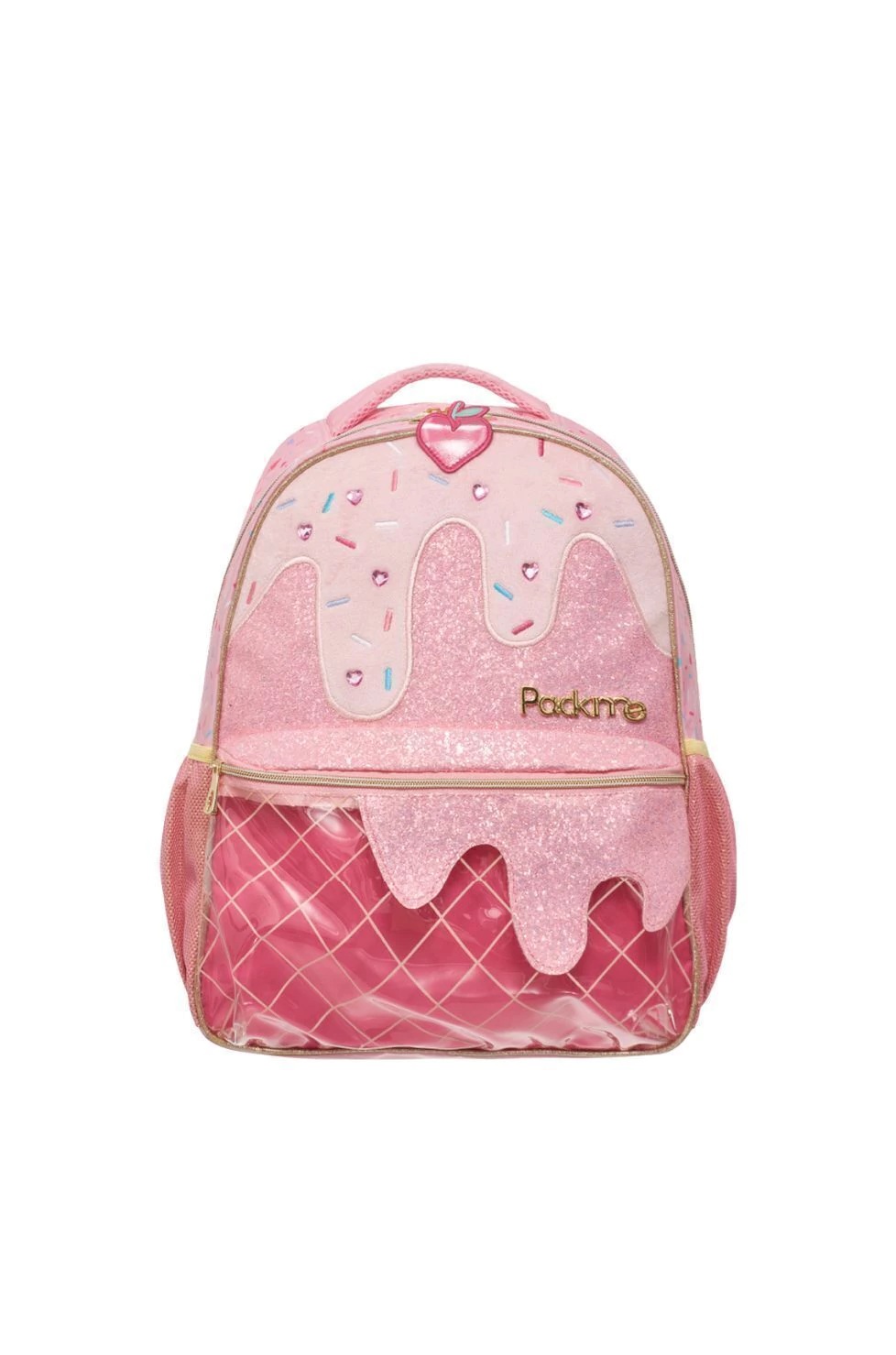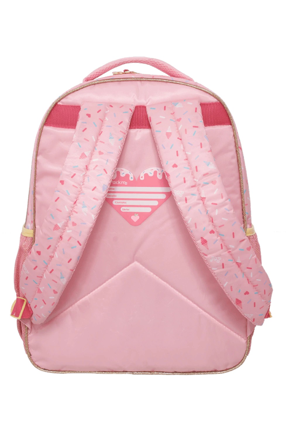 Descripción: Descripción Mochila Gelato Packme. Colección confeccionada en poliéster estampado. Compartimento principal y bolsillo frontal con cierre de plástico. Bolsillo laterales abiertos en rejilla ajustable. Espalda con goma espuma. Etiqueta de goma. Medidas Aproximadas: Altura:40 cm. Ancho:30 cm. Base:12 cm.