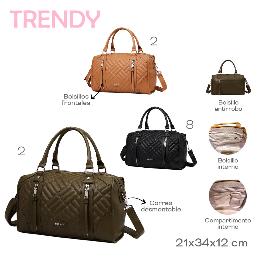 Descripción: Material: 100% Cuero PU de alta calidad, resistente y fácil de mantener. Interior: Forrado con el logo de la marca, brindando un acabado exclusivo. Diseño y Organización. Dos asas de transporte: Permiten llevarla cómodamente en la mano o al hombro. Tira extraÃble y ajustable de hasta 130 cm: Ideal para usarla como bandolera. Tres bolsillos internos: Espacios diseñados para organizar objetos personales. Dos bolsillos frontales: Agregan estilo y funcionalidad al diseño. Bolsillo posterior: Perfecto para guardar lo esencial con acceso rápido. Incluye packaging exclusivo: Presentación premium, ideal para regalo. Ventajas del Producto. Estilo elegante y moderno: Su diseño acolchonado la hace destacar entre otros modelos. Estructura resistente: Material duradero que mantiene su forma con el uso. Funcionalidad óptima: Diversos compartimentos para mantener todo organizado. Opciones de uso versátiles: Se puede llevar en la mano o cruzada con la correa ajustable. Ideal para cualquier ocasión: Perfecta para el trabajo, salidas o eventos especiales.