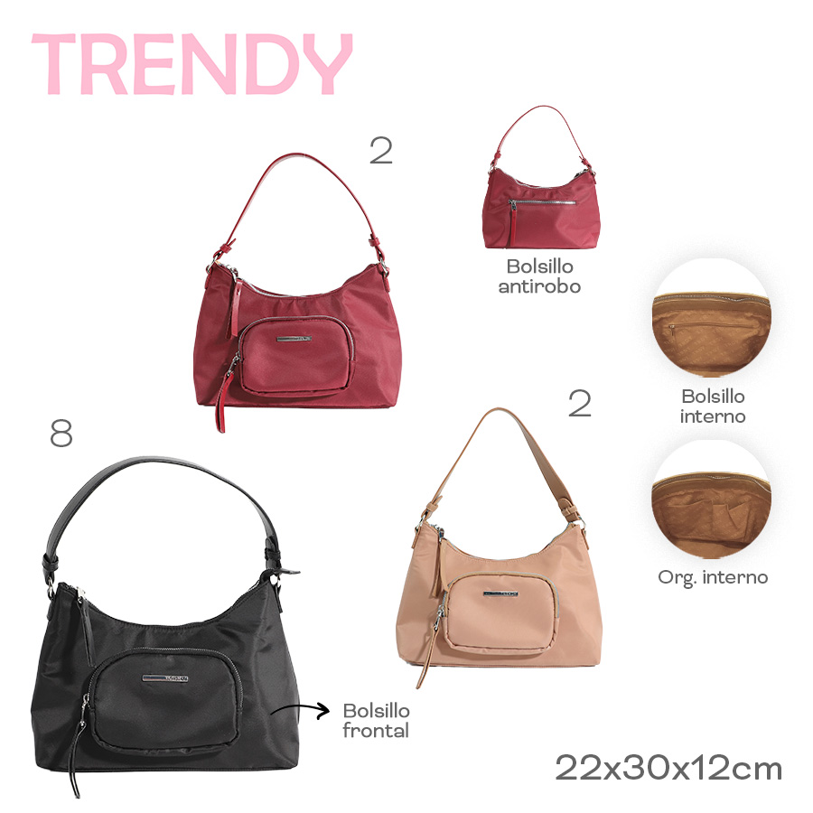 Descripción: CARTERA ANTIRROBO MUJER TRENDY. · Amplio compartimiento principal. · Confeccionada en Nylon. · Asa confeccionada en Eco Cuero. Cartera de Mujer Trendy - Amplio compartimiento Principal - Interior forrado - Cierre Reforzado ¡Lleva todas tus cosas protegidas! La más Segura, Ultra Liviana y Resistente - Diseño cómodo y a la moda, elegante ideal para tus salidas o paseos. · Cartera Trendy Antirrobo. · Material resistente anti desgarre. · Zippers metálicos. · Cierres reforzados. · Interior forrado con el logo de la marca. · Bolsillo interno. · Organizador interno. · Resistente y Liviana. · Elegante ideal para tus salidas o paseos. · Medidas: Alto 22cm x Ancho 30cm x Profundidad 12cm.
