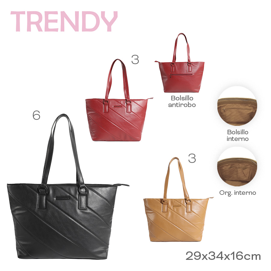 Descripción: · Amplio compartimiento principal. · Confeccionada en Eco Cuero. · Bolsillo posterior antirrobo. Cartera Tote de Mujer Trendy - Amplio compartimiento Principal - Interior forrado - Cierre Reforzado ¡Lleva todas tus cosas protegidas! La más Segura, Ultra Liviana y Resistente - Diseño cómodo y a la moda, elegante ideal para tus salidas o paseos. · Cartera Tote Antirrobo Trendy. · Bolsillos internos organizadores. · Material resistente anti desgarre. · Cierres reforzados. · Zippers metálicos. · Asas superiores reforzadas. · Logo frontal Trendy. · Interior forrado con logo de la marca. · Resistente y liviana. · Elegante ideal para tus salidas o paseos. · Medidas: Alto 29cm x Ancho 34cm x Prof. 16cm.