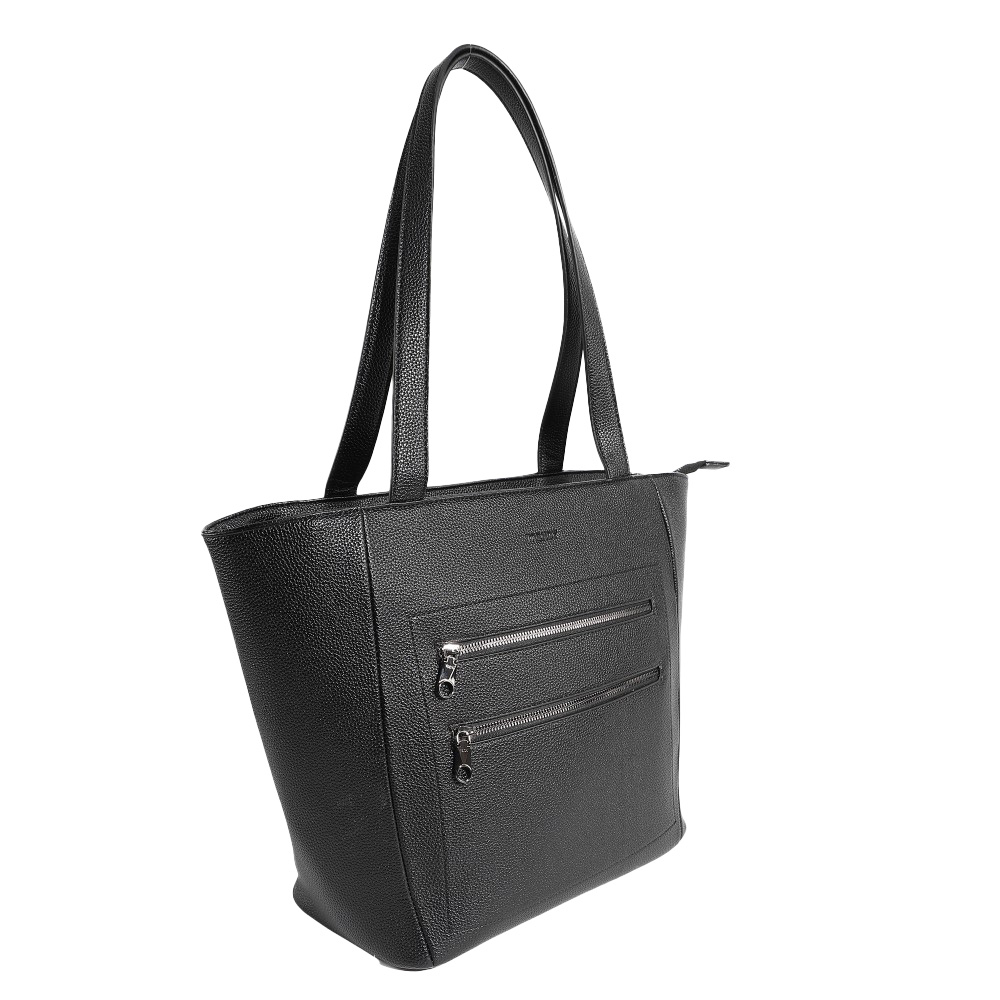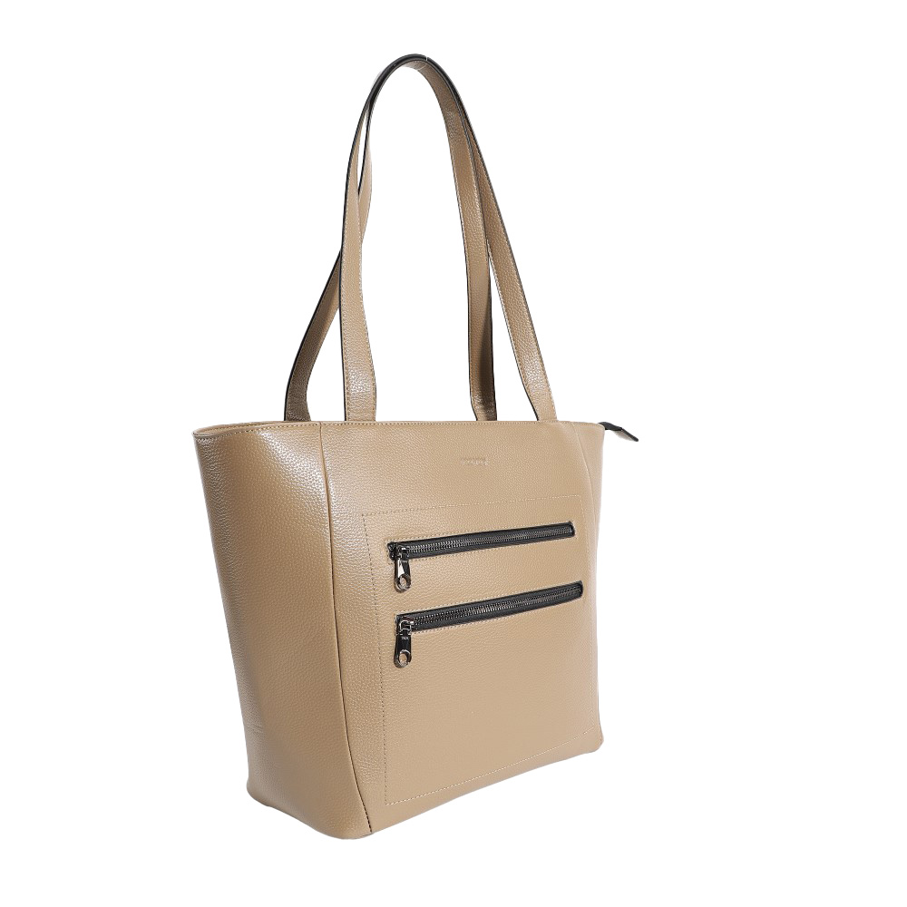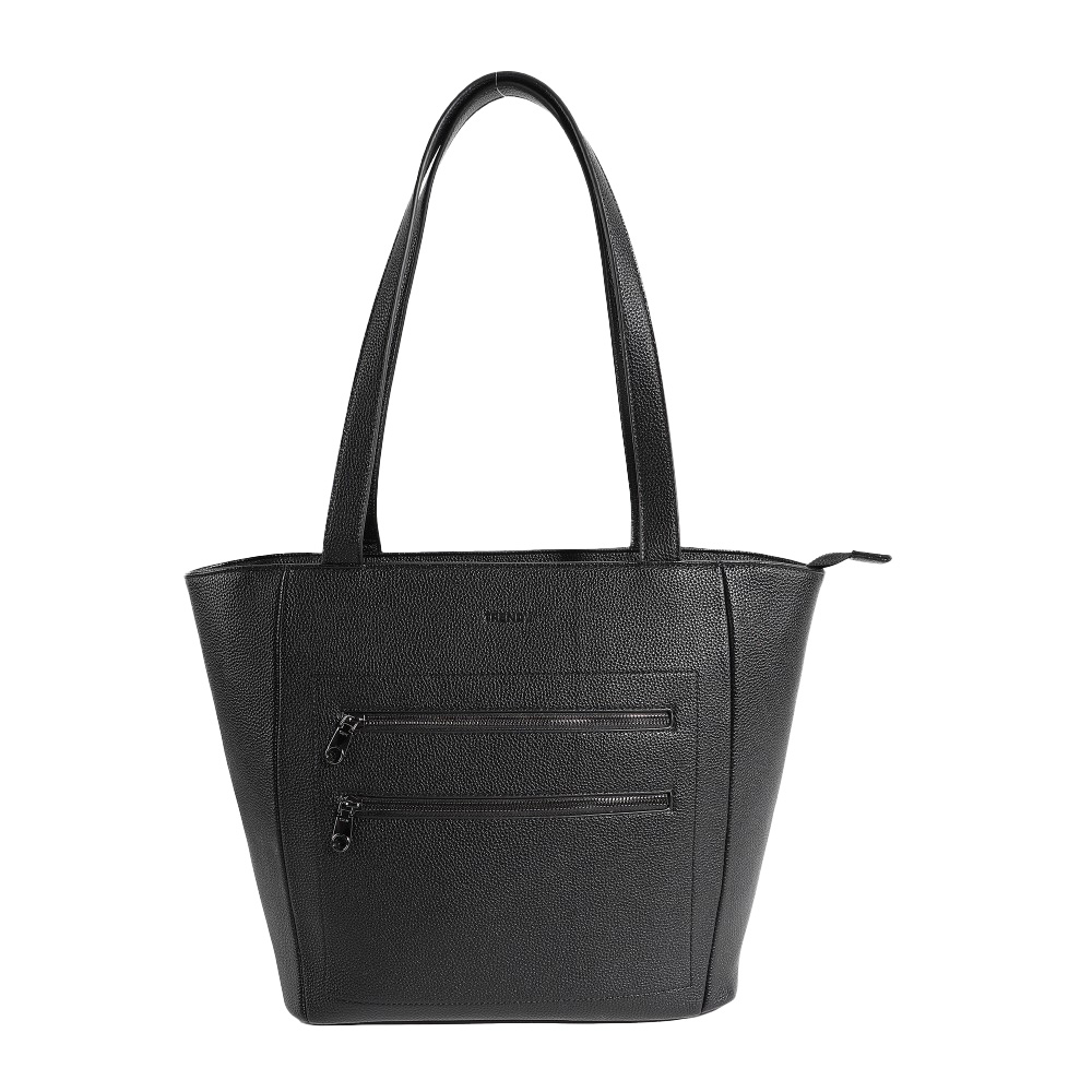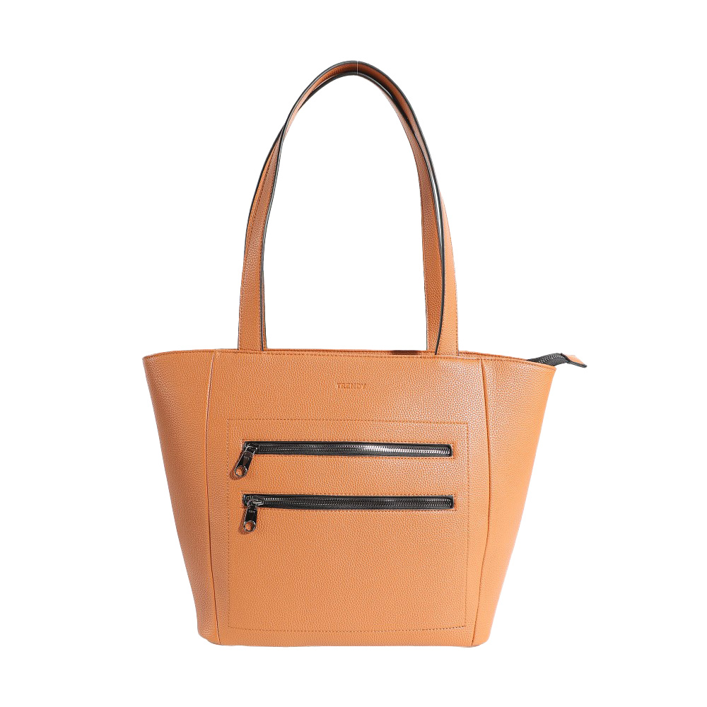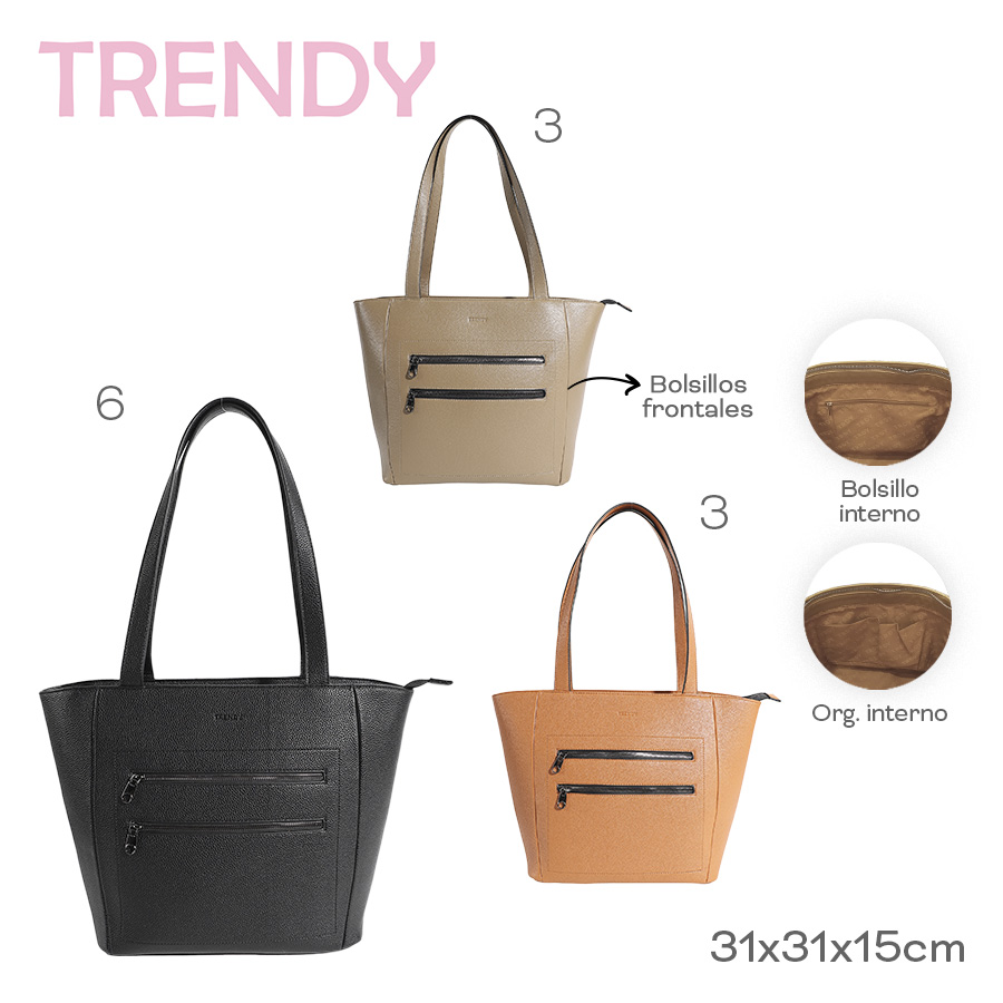 Descripción: · Amplio compartimiento principal. · Confeccionado en Eco cuero. · Bolsillos internos organizadores. Cartera liviana, confeccionada en Eco Cuero. Diseño práctico con cierres reforzados. Ideal para llevar todo y tener las manos libres. · Cartera elegante mujer trendy. · Dos bolsillos frontales con cierre. · Material altamente resistente anti-desgarre. · Dos asas superiores reforzadas. · Logo frontal Trendy. · Interior forrado con el logo de la marca. · Cierres reforzados. · Zippers metálicos. · Diseño atemporal, perfecto para salidas o paseos. · Medidas: Alto 31cm x Ancho 31cm x Prof. 15cm.