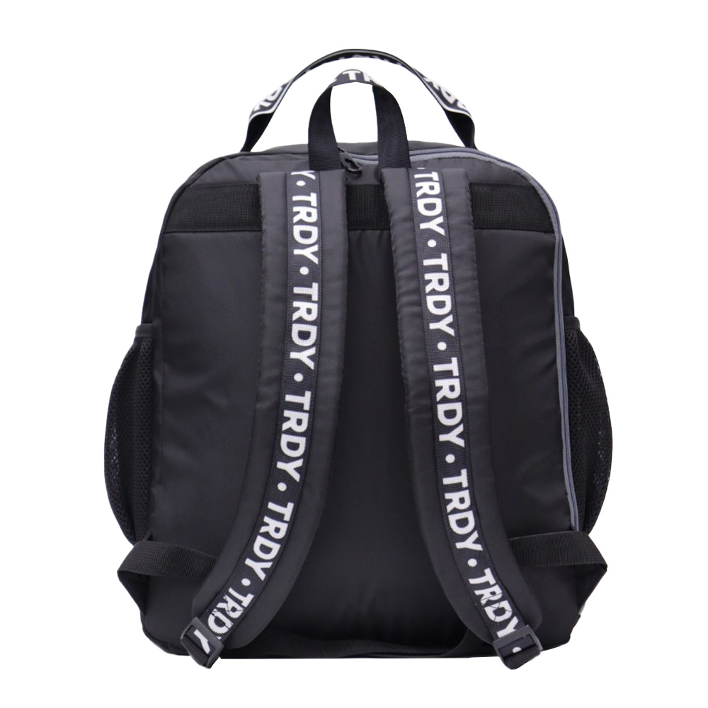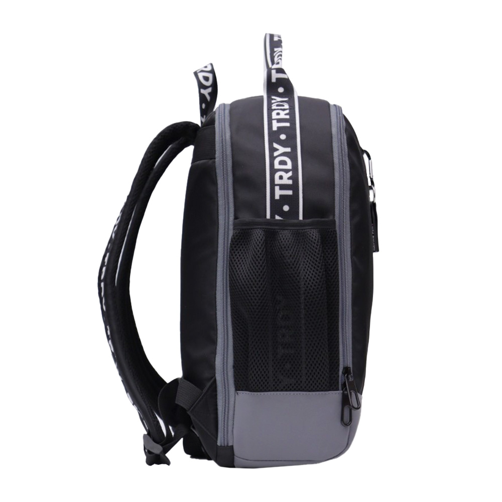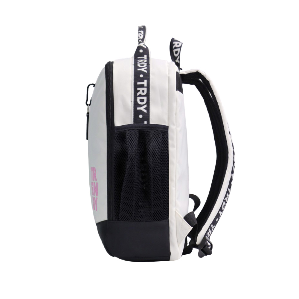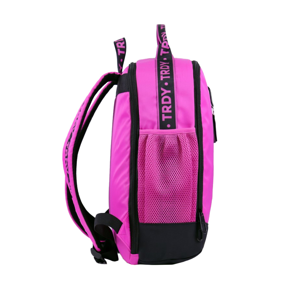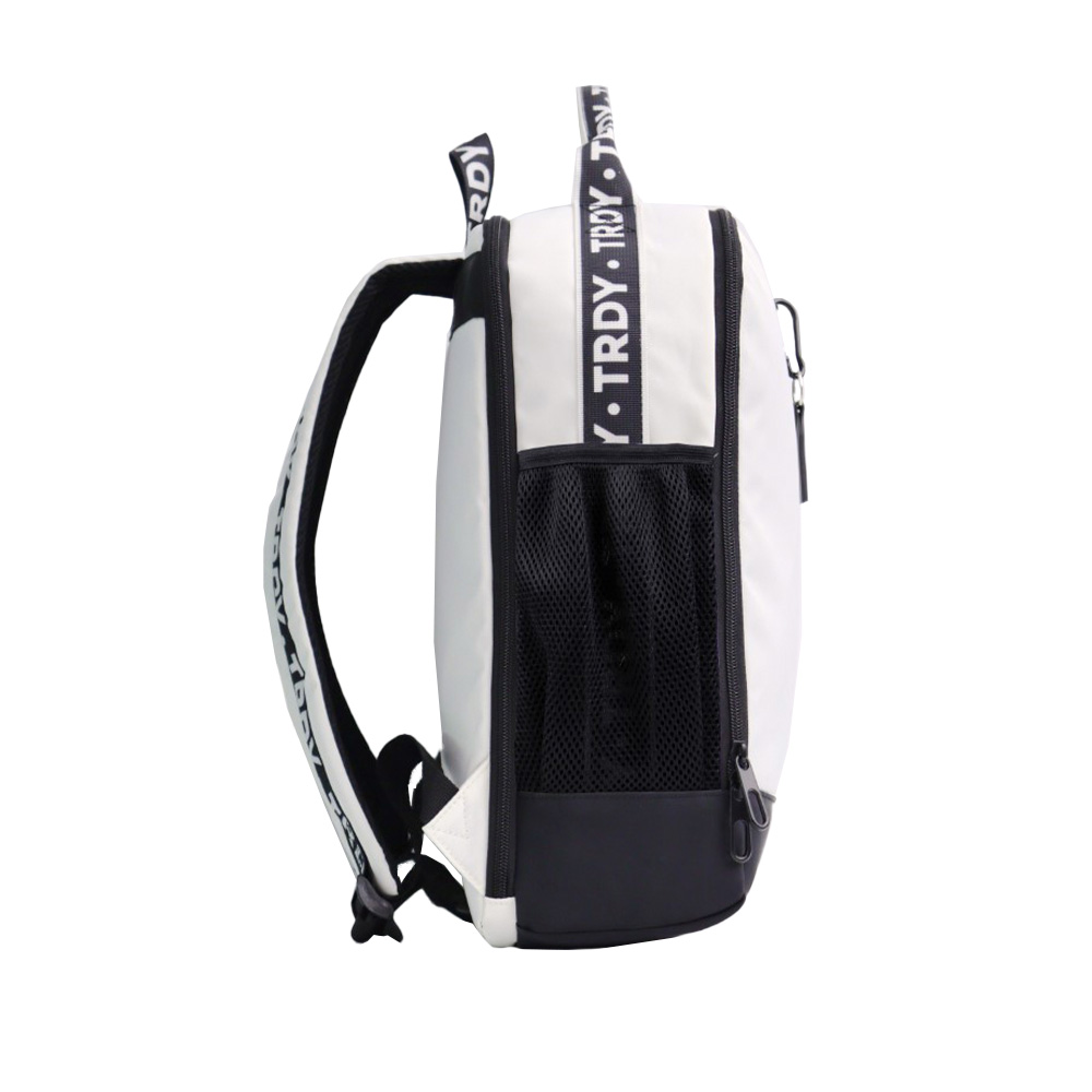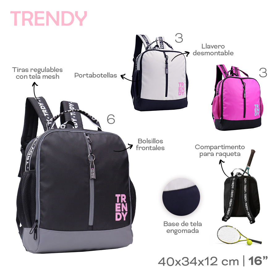 -Contiene: Un bolsillo frontal, un bolsillo principal, un compartimiento posterior para raqueta, dos bolsillos laterales, dos asas de transporte superior, tiras regulables con tela Mesh, base de tela engomada.