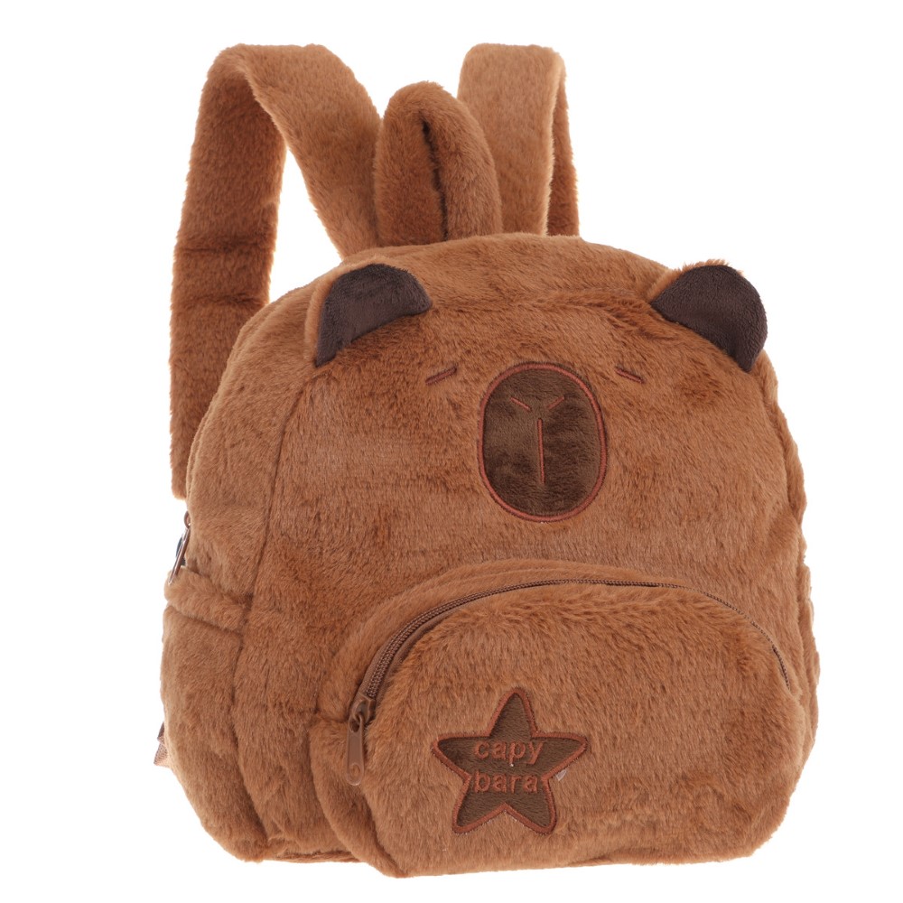 Descripción: -Material: 100% Peluche. -Medidas: 28cm alto x 25cm ancho x 11cm profundidad. -Contiene: Bolsillo principal, bolsillo frontal, asa de transporte superior y tiras regulables.