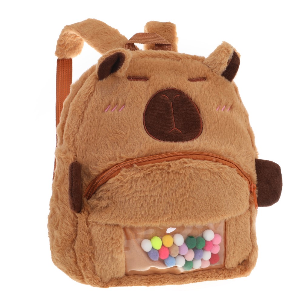 Descripción: -Material: 100% Peluche. -Medidas: 30cm alto x 24cm ancho x 8cm profundidad. -Contiene: Bolsillo principal, bolsillo frontal, asa de transporte superior y tiras regulables.