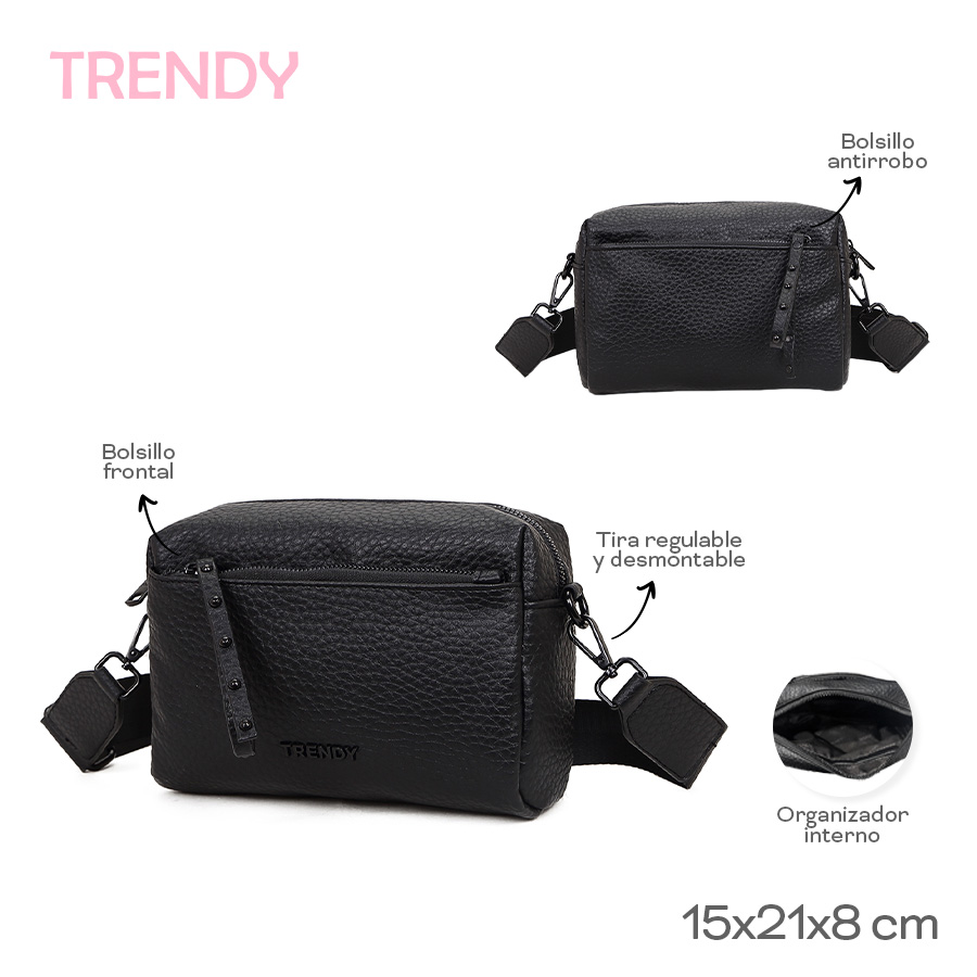 Descripción: -Material: Cuero PU. -Medidas: Alto 15 cm x Ancho 21 cm x Profundidad 8 cm. -Contiene: *Un Bolsillo principal. *Un bolsillo interno organizador. *Un bolsillo interno con cierre. *Un bolsillo frontal. *Un bolsillo posterior. *Una tira de transporte regulable y desmontable. *Interior forrado con el logo de la marca.