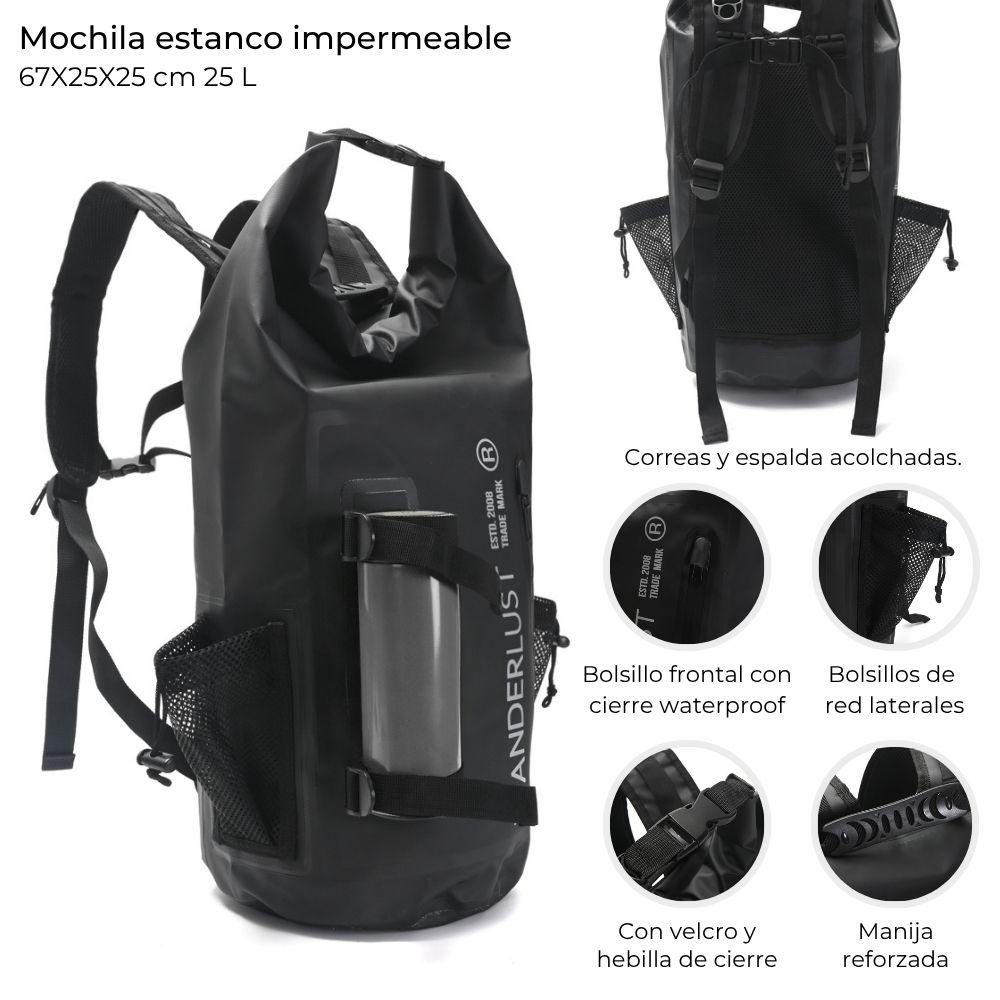 Descripción: Mochila estanco impermeable 67X25X25 cm 25 L con velcro y hebilla de cierre.