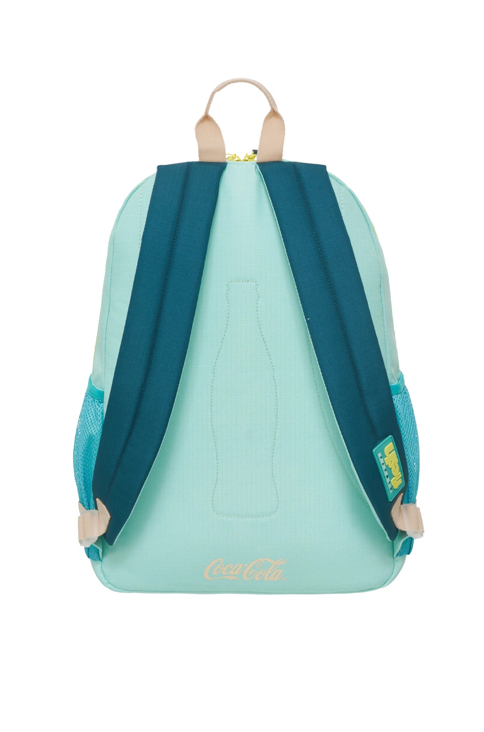Descripción: Descripción Mochila COCA-COLA Refreshing Green Original con Licencia. Colección confeccionada en poliéster con logo estampado. Compartimento principal y bolsillos frontales con cierre de plástico a tono. Tiradores de plástico rÃgido. Bolsillo laterales abiertos en rejilla ajustable. Espalda acolchada personalizada con pespuntes tono sobre tono. Forro personalizado con estampado termograbado. Medidas Aproximadas: Altura:43 cm. Ancho:34 cm. Base:13 cm.